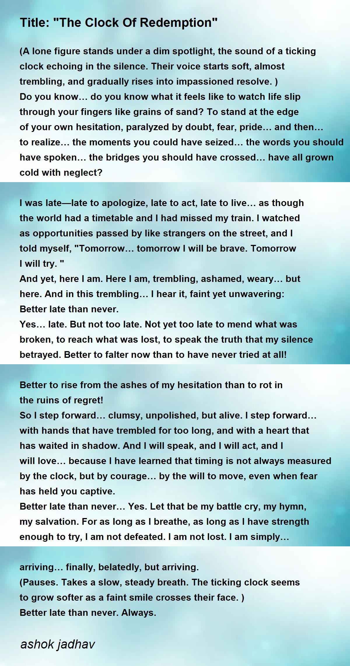 (A lone figure stands under a dim spotlight, the sound of a ticking clock echoing in the silence. Their voice starts soft, almost trembling, and gradually rises into impassioned resolve.)