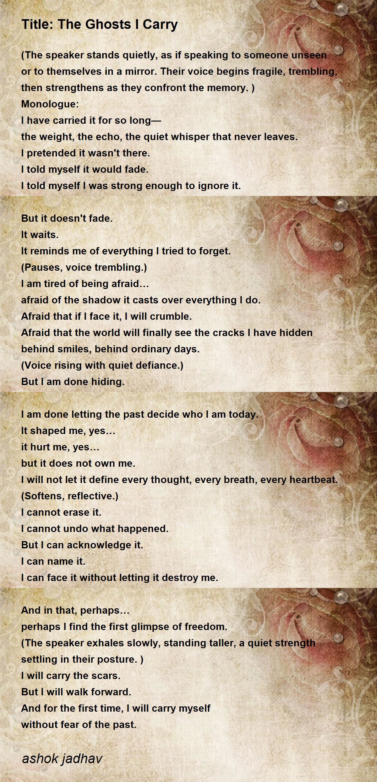 (The speaker stands quietly, as if speaking to someone unseen or to themselves in a mirror. Their voice begins fragile, trembling, then strengthens as they confront the memory.)