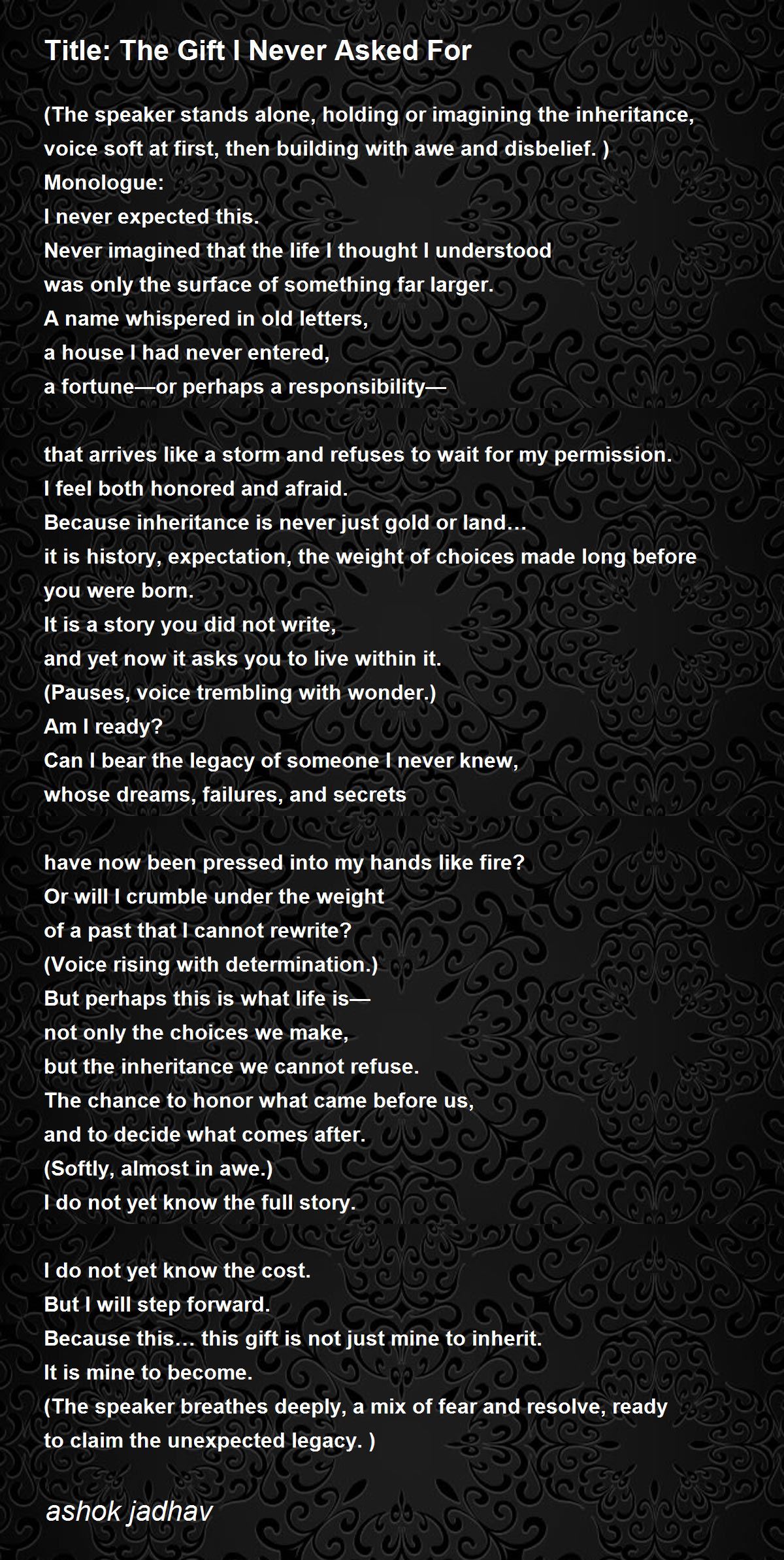 (The speaker breathes deeply, a mix of fear and resolve, ready to claim the unexpected legacy.)
