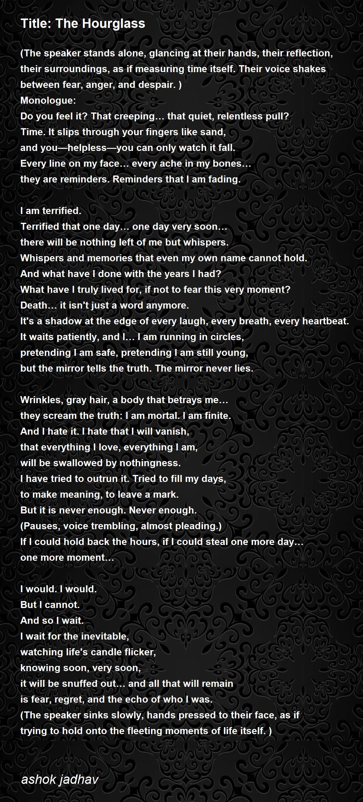 (The speaker stands alone, glancing at their hands, their reflection, their surroundings, as if measuring time itself. Their voice shakes between fear, anger, and despair.)