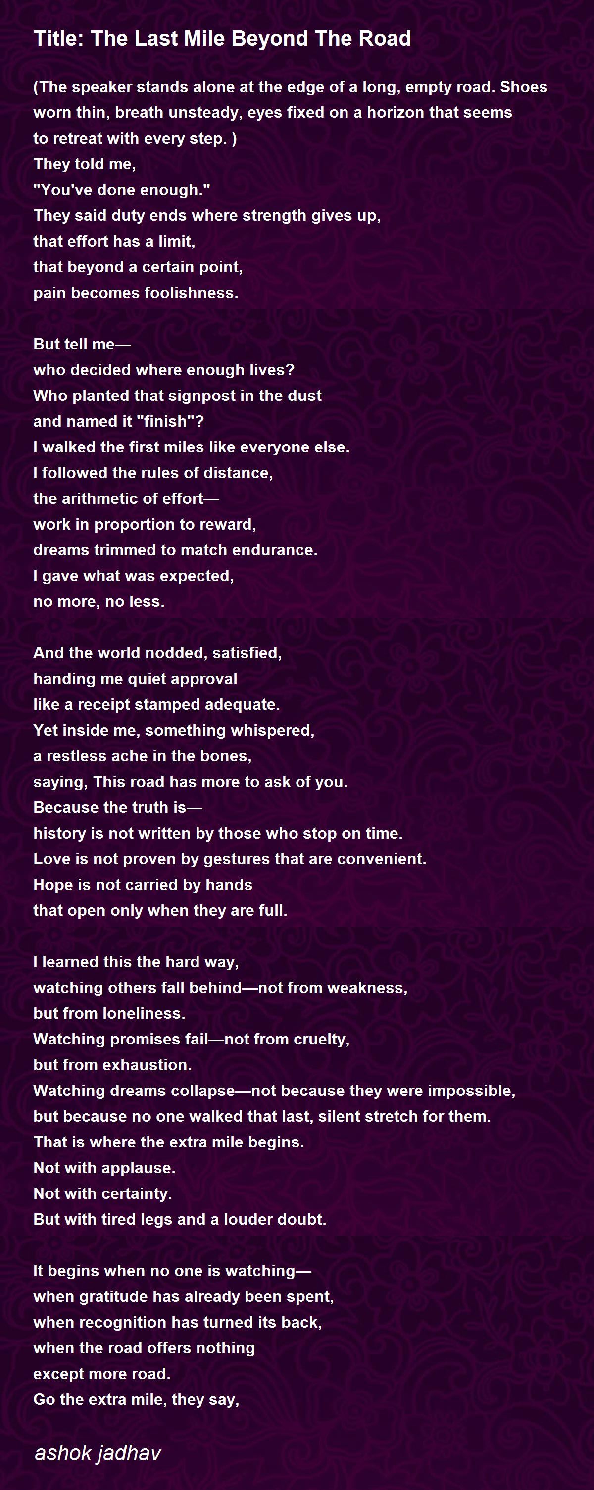(The speaker stands alone at the edge of a long, empty road. Shoes worn thin, breath unsteady, eyes fixed on a horizon that seems to retreat with every step.)