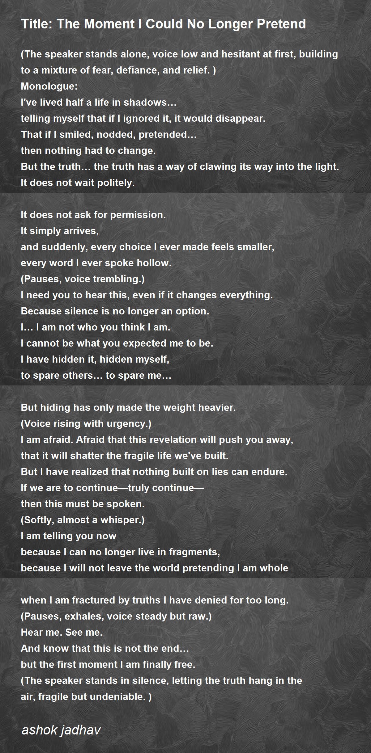 (The speaker stands alone, voice low and hesitant at first, building to a mixture of fear, defiance, and relief.)