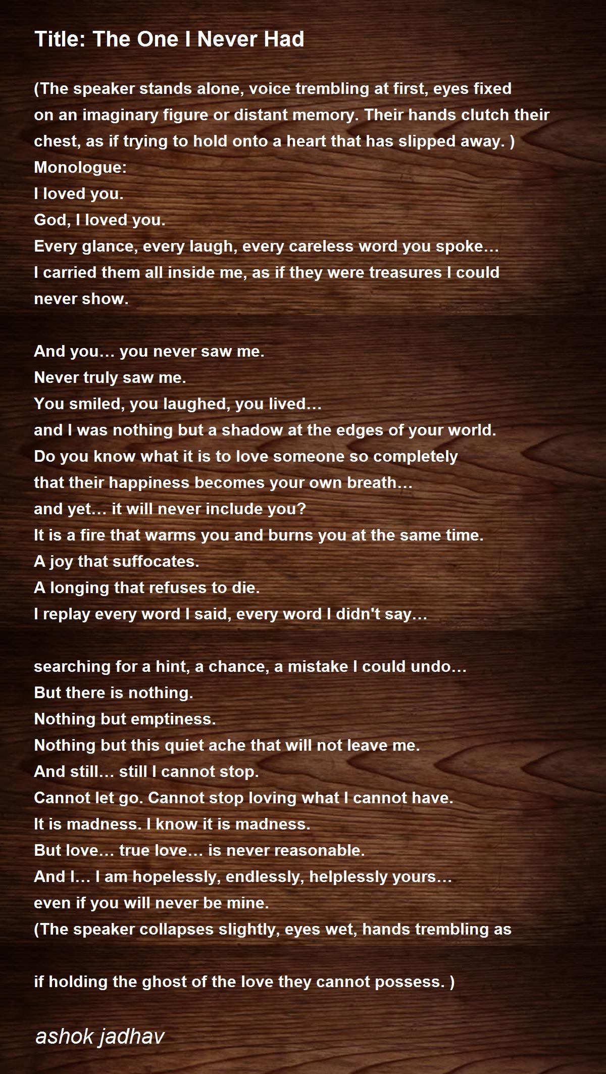 (The speaker collapses slightly, eyes wet, hands trembling as if holding the ghost of the love they cannot possess.)
