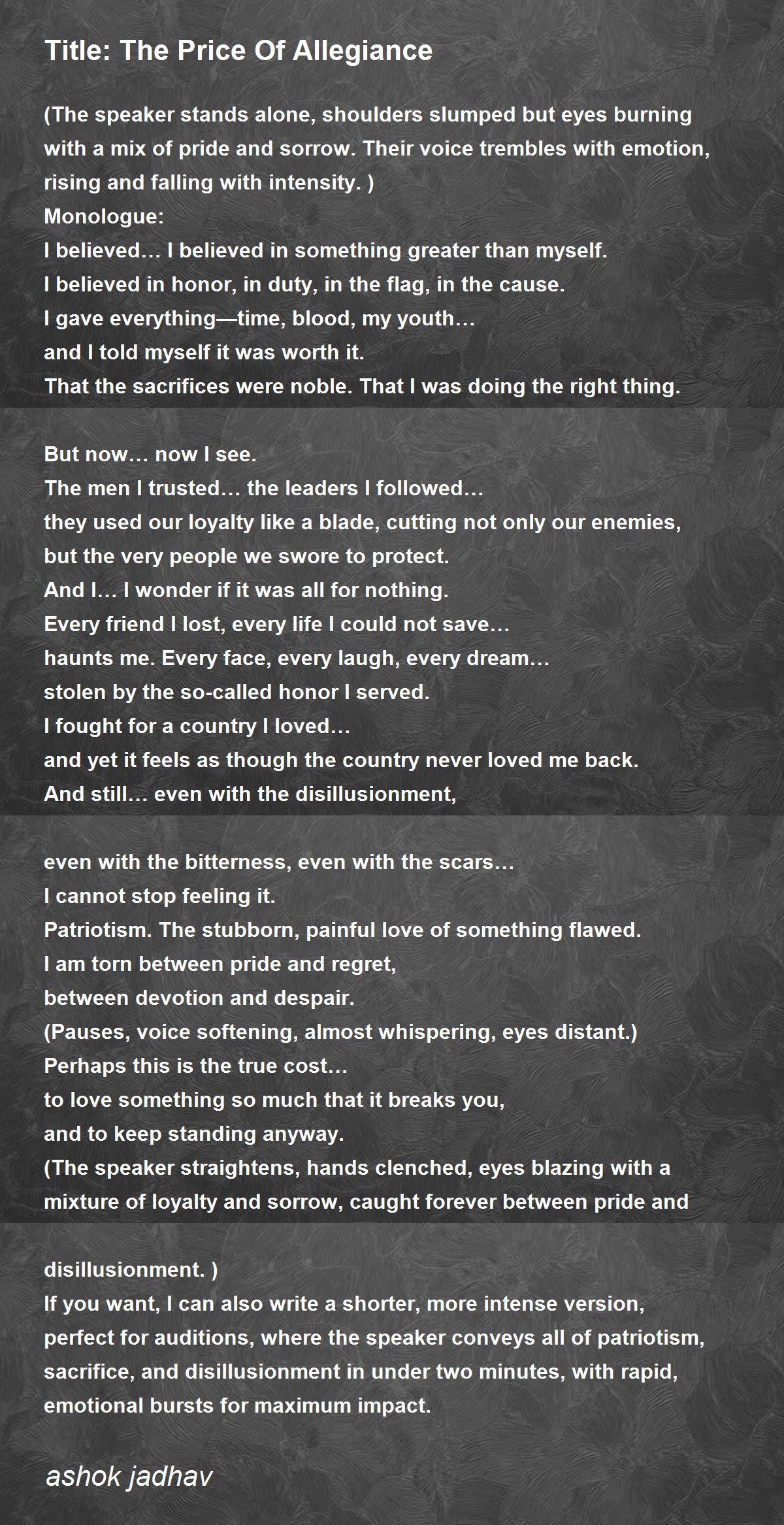 If you want, I can also write a shorter, more intense version, perfect for auditions, where the speaker conveys all of patriotism, sacrifice, and disillusionment in under two minutes, with rapid, emotional bursts for maximum impact.