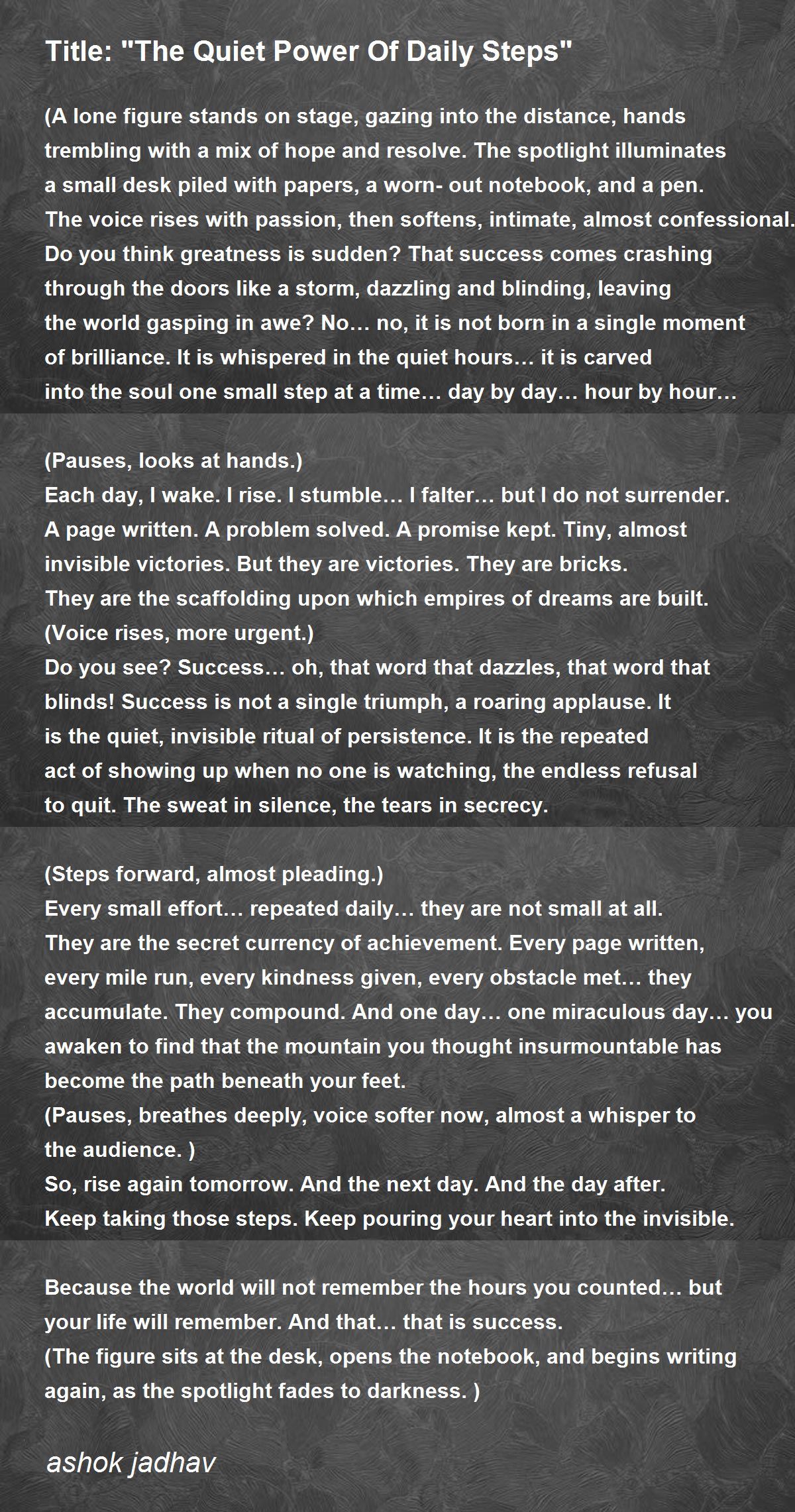 Each day, I wake. I rise. I stumble… I falter… but I do not surrender. A page written. A problem solved. A promise kept. Tiny, almost invisible victories. But they are victories. They are bricks. They are the scaffolding upon which empires of dreams are built.