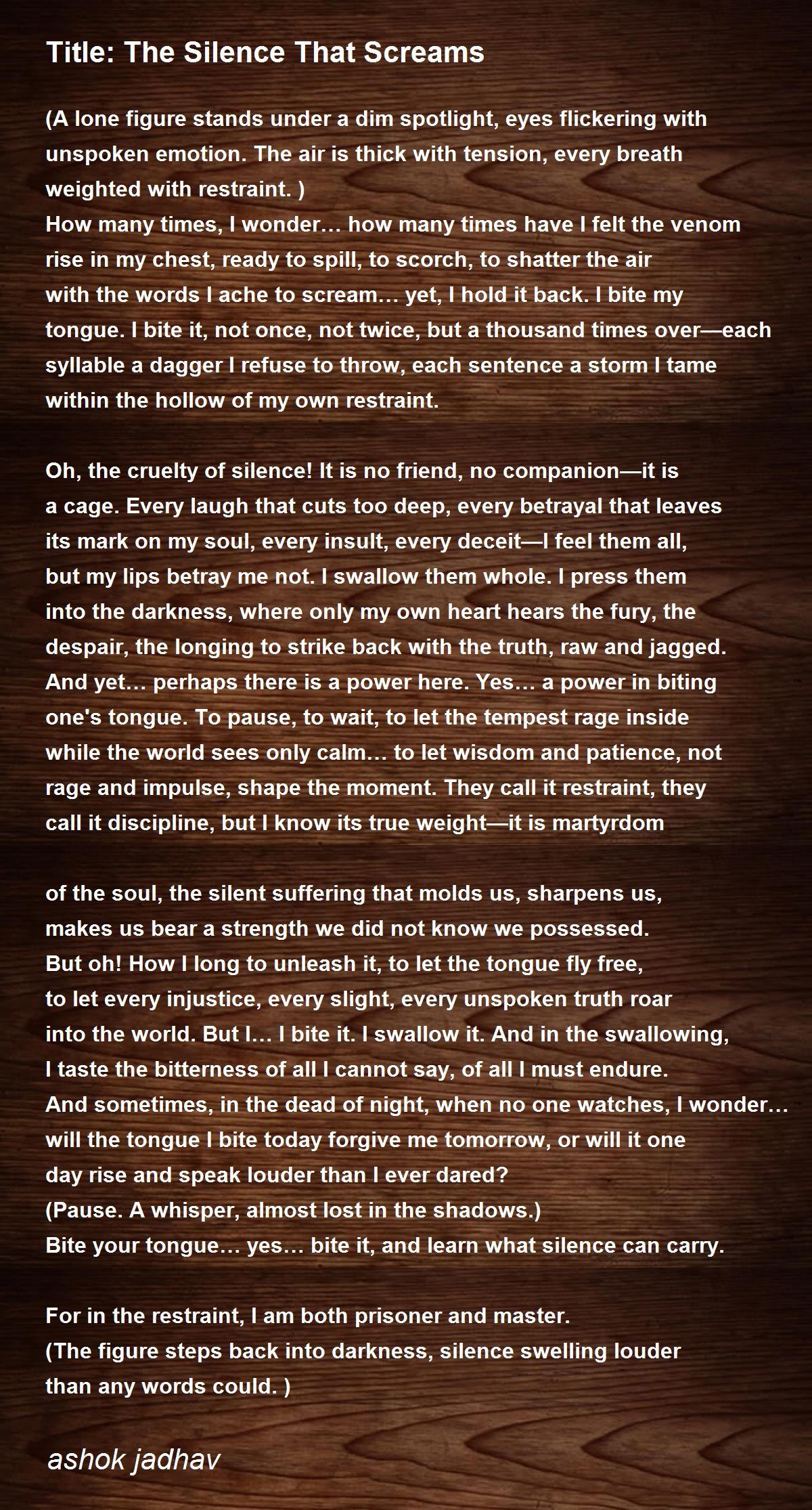 But oh! How I long to unleash it, to let the tongue fly free, to let every injustice, every slight, every unspoken truth roar into the world. But I… I bite it. I swallow it. And in the swallowing, I taste the bitterness of all I cannot say, of all I must endure. And sometimes, in the dead of night, when no one watches, I wonder… will the tongue I bite today forgive me tomorrow, or will it one day rise and speak louder than I ever dared?