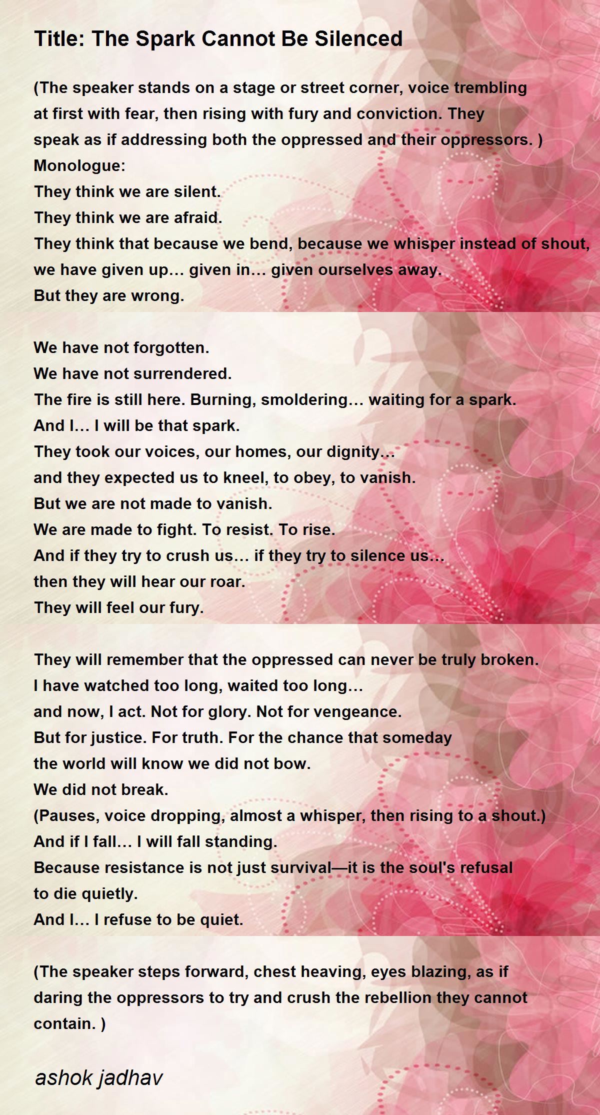 (The speaker steps forward, chest heaving, eyes blazing, as if daring the oppressors to try and crush the rebellion they cannot contain.)