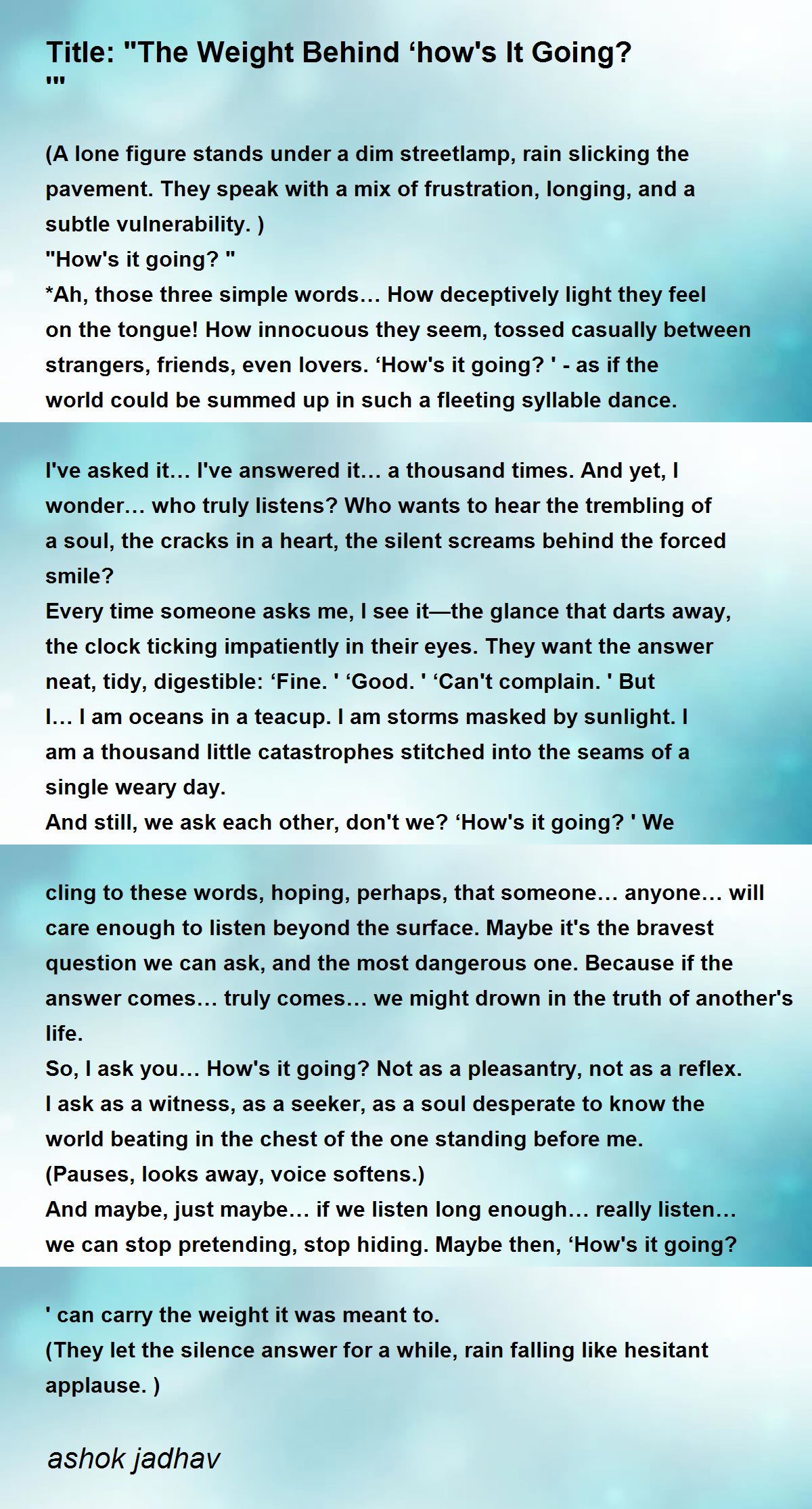 And still, we ask each other, don't we? ‘How's it going? ' We cling to these words, hoping, perhaps, that someone… anyone… will care enough to listen beyond the surface. Maybe it's the bravest question we can ask, and the most dangerous one. Because if the answer comes… truly comes… we might drown in the truth of another's life.