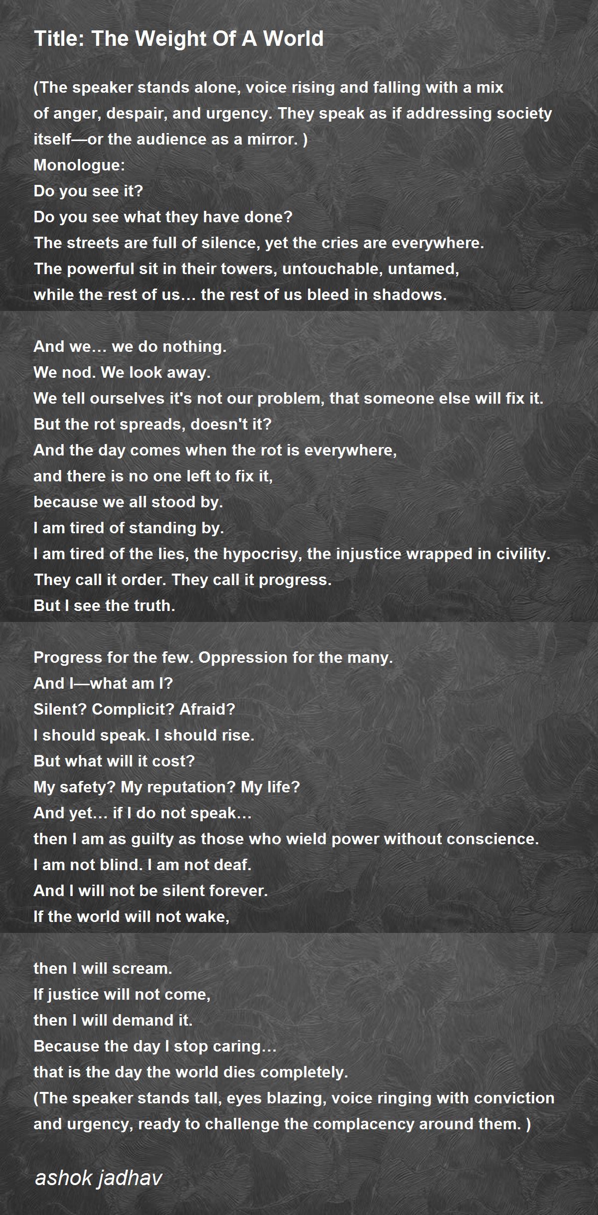 (The speaker stands alone, voice rising and falling with a mix of anger, despair, and urgency. They speak as if addressing society itself—or the audience as a mirror.)