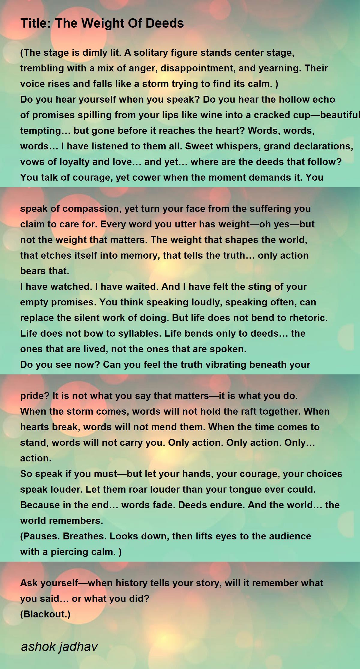 You talk of courage, yet cower when the moment demands it. You speak of compassion, yet turn your face from the suffering you claim to care for. Every word you utter has weight—oh yes—but not the weight that matters. The weight that shapes the world, that etches itself into memory, that tells the truth… only action bears that.