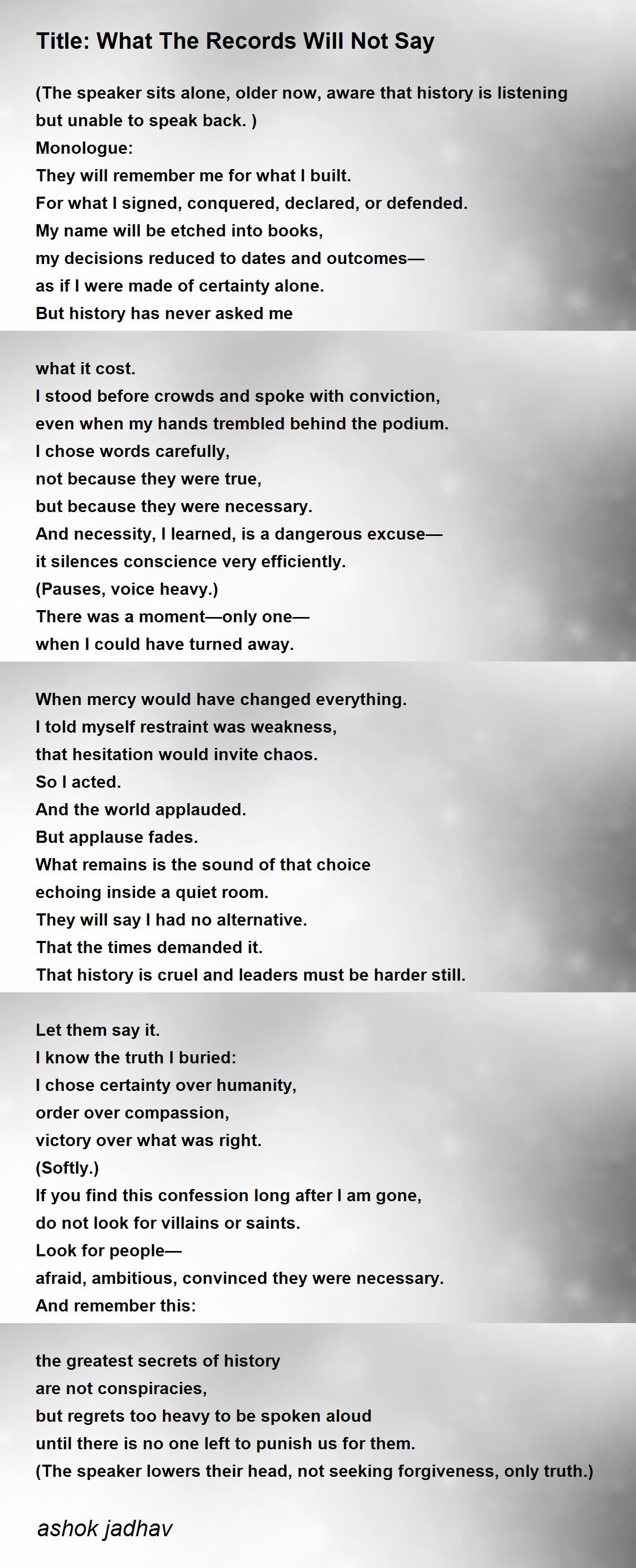 (The speaker sits alone, older now, aware that history is listening but unable to speak back.)