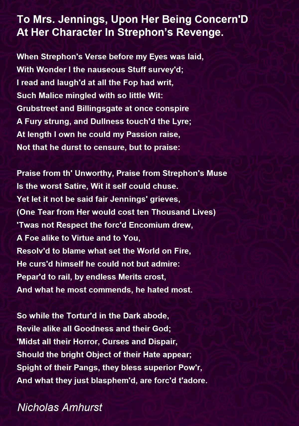 Yet let it not be said fair Jennings' grieves,