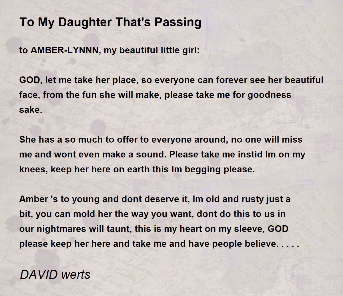 Amber 's to young and dont deserve it, Im old and rusty just a bit, you can mold her the way you want, dont do this to us in our nightmares will taunt, this is my heart on my sleeve, GOD please keep her here and take me and have people believe.....