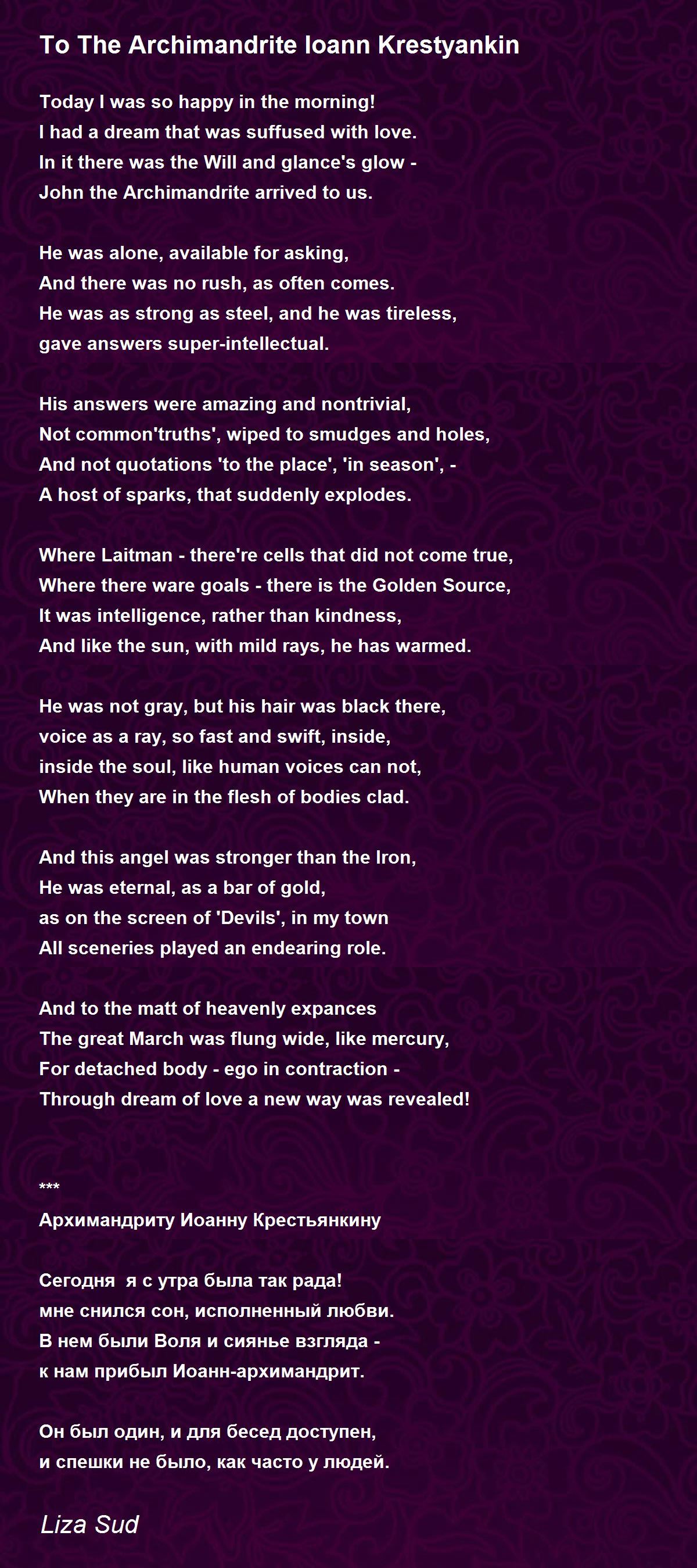 This man is a spiritual evolution beyond the normal human being of the present: Prayer, Service, Suffering have raised him above the common person, and yet we common ones are the ones he loves and serves. And this is that AGAPE love of one's neighbor which is the center of the Beatitudes. Your poem is short but the light of Ioann is released in a long gleaming ray that expands and shines on us all. This is the poem that answers and amplifies my recent poems. It conveys the reality of faith behind a a poem like my Hymn to the Lord in Lent. I'm going to place a copy with my attempts at writing not just about religion but releasing energy of the Spirit through writing. I was ready for this poem, dear Liza. It came exactly on time.