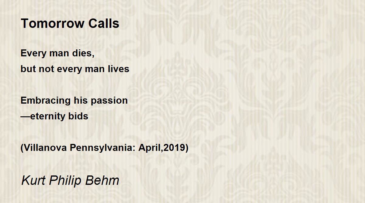 Every man dies, but not every man lives Embracing his passion —eternity bids (Villanova Pennsylvania: April,2019)