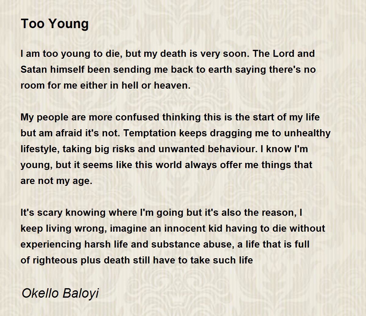 My people are more confused thinking this is the start of my life but am afraid it's not. Temptation keeps dragging me to unhealthy lifestyle, taking big risks and unwanted behaviour. I know I'm young, but it seems like this world always offer me things that are not my age.