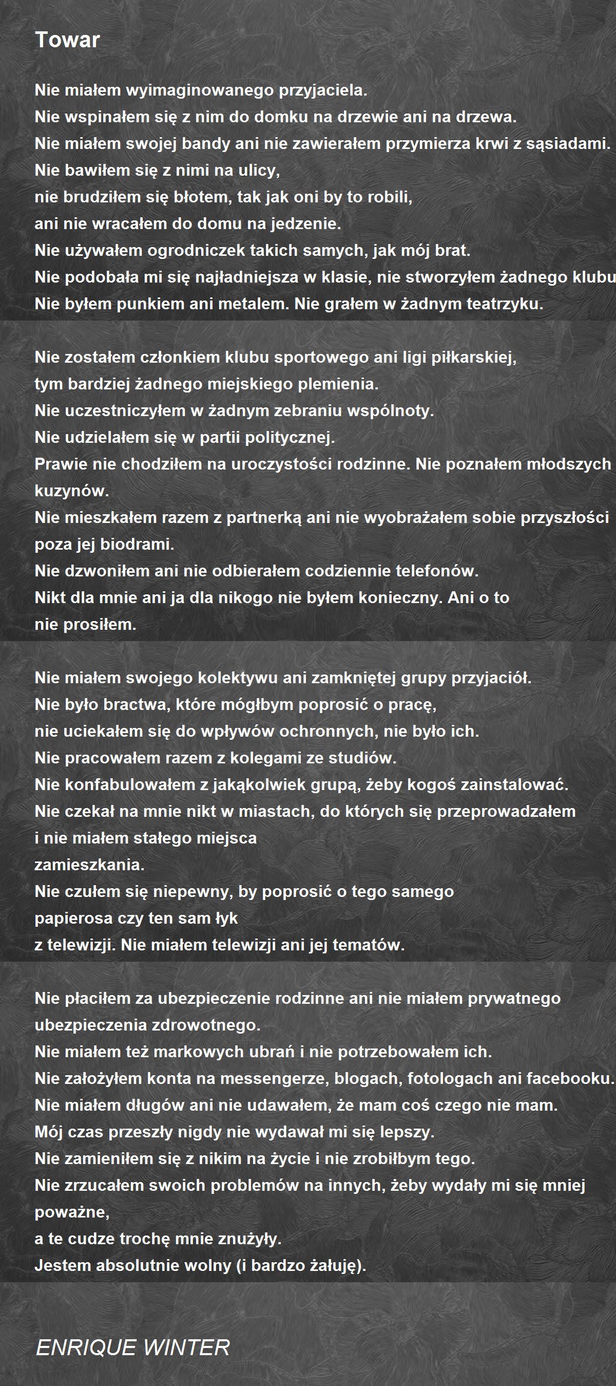Nikt dla mnie ani ja dla nikogo nie byłem konieczny. Ani o to nie prosiłem.