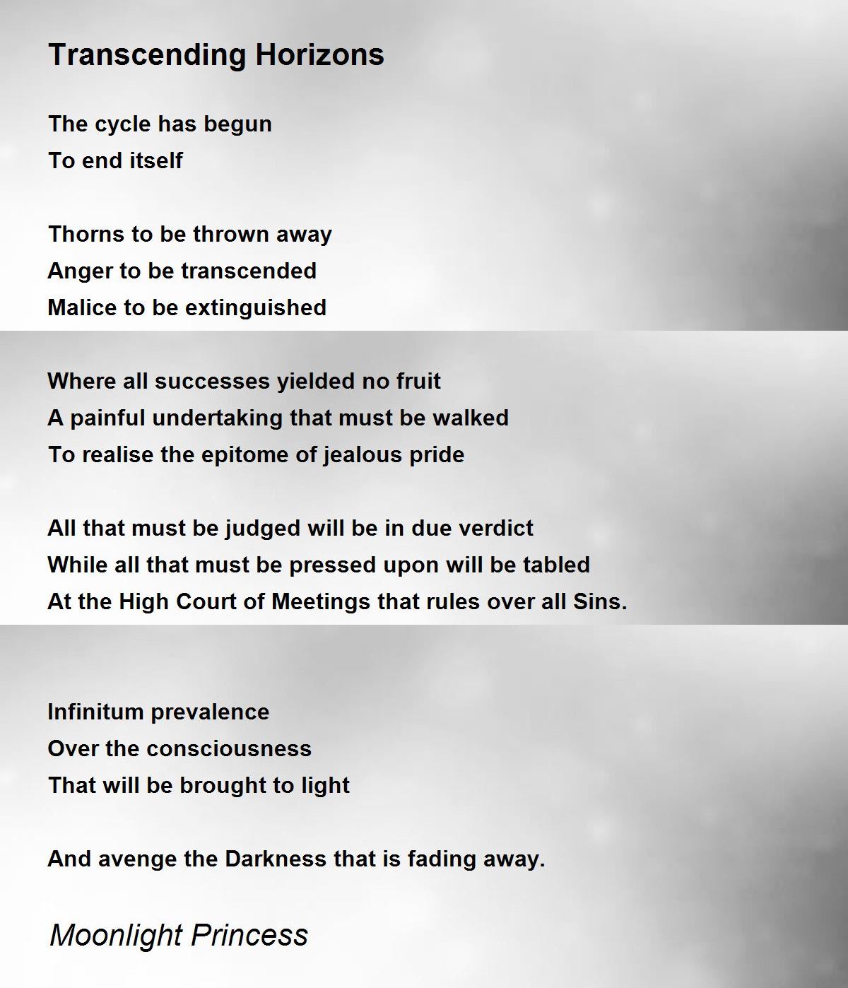 nfinitum prevalence Over the consciousness That will be brought to light. spiritual poem leading to repentance and light...... thank u dear poet. tony