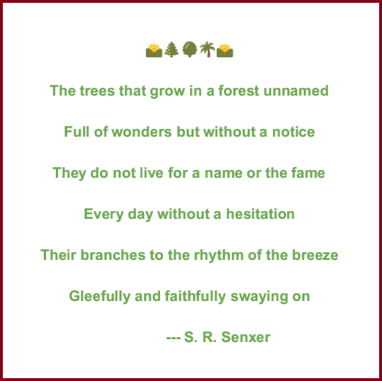 They do not live for a name or the fame Every day without a hesitation- - -so true they dont care for name or fame or are they taken up when someone praises it or are they depressed when someone speak ill of it. we have to learn a lot from a tree........ they flourish where they are planted..........thanku dear poet. tony
