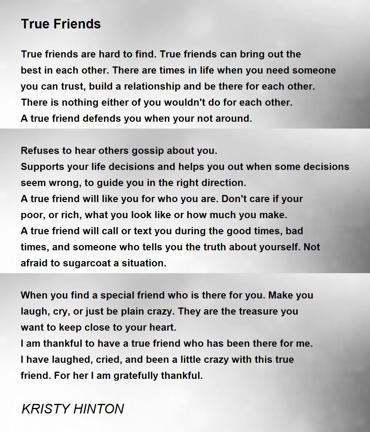 A true friend will like you for who you are. Don't care if your poor, or rich, what you look like or how much you make.