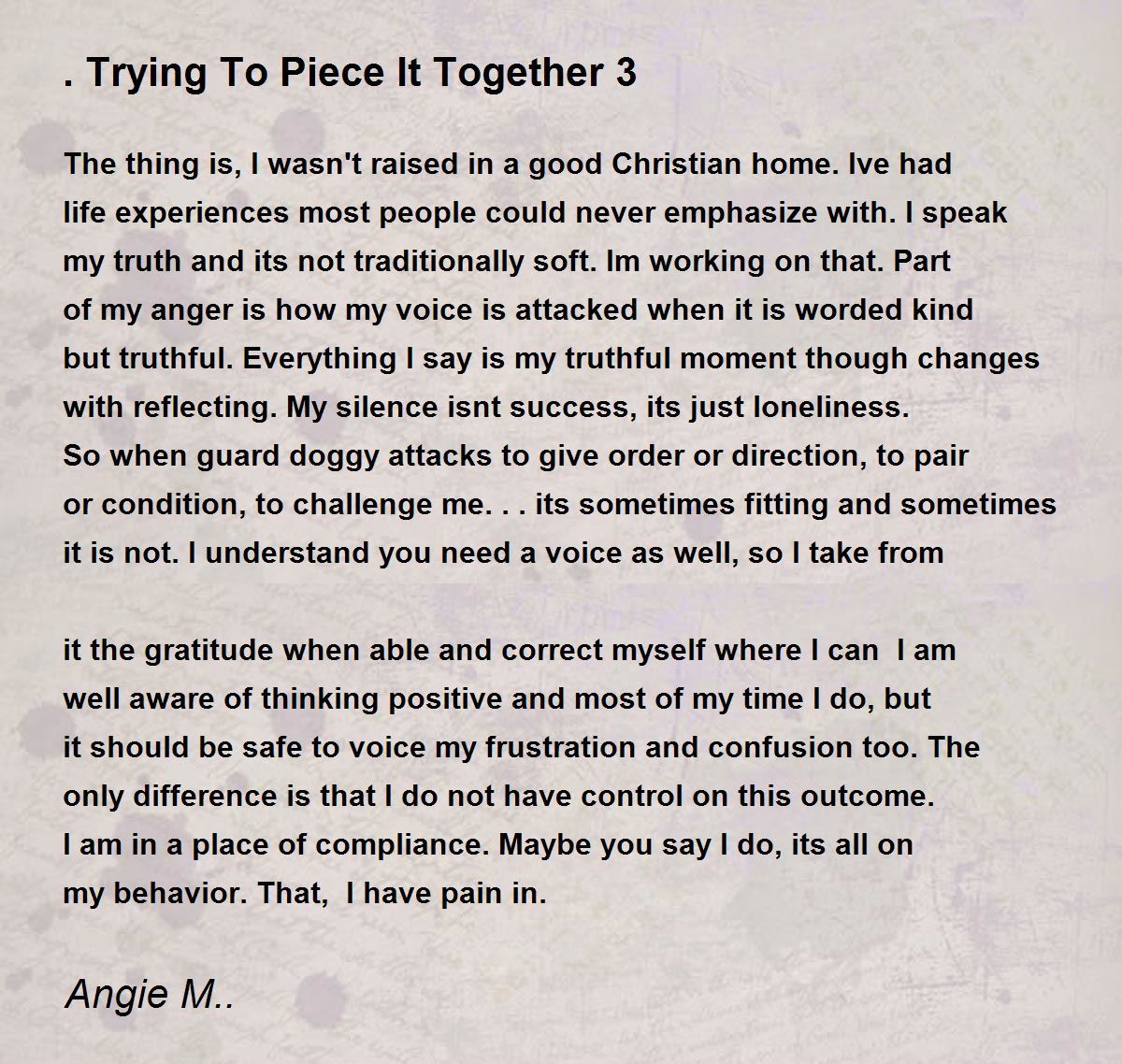 The thing is, I wasn't raised in a good Christian home. Ive had life experiences most people could never emphasize with. I speak my truth and its not traditionally soft. Im working on that. Part of my anger is how my voice is attacked when it is worded kind but truthful. Everything I say is my truthful moment though changes with reflecting. My silence isnt success, its just loneliness. So when guard doggy attacks to give order or direction, to pair or condition, to challenge me...its sometimes fitting and sometimes it is not. I understand you need a voice as well, so I take from it the gratitude when able and correct myself where I can I am well aware of thinking positive and most of my time I do, but it should be safe to voice my frustration and confusion too. The only difference is that I do not have control on this outcome. I am in a place of compliance. Maybe you say I do, its all on my behavior. That, I have pain in.
