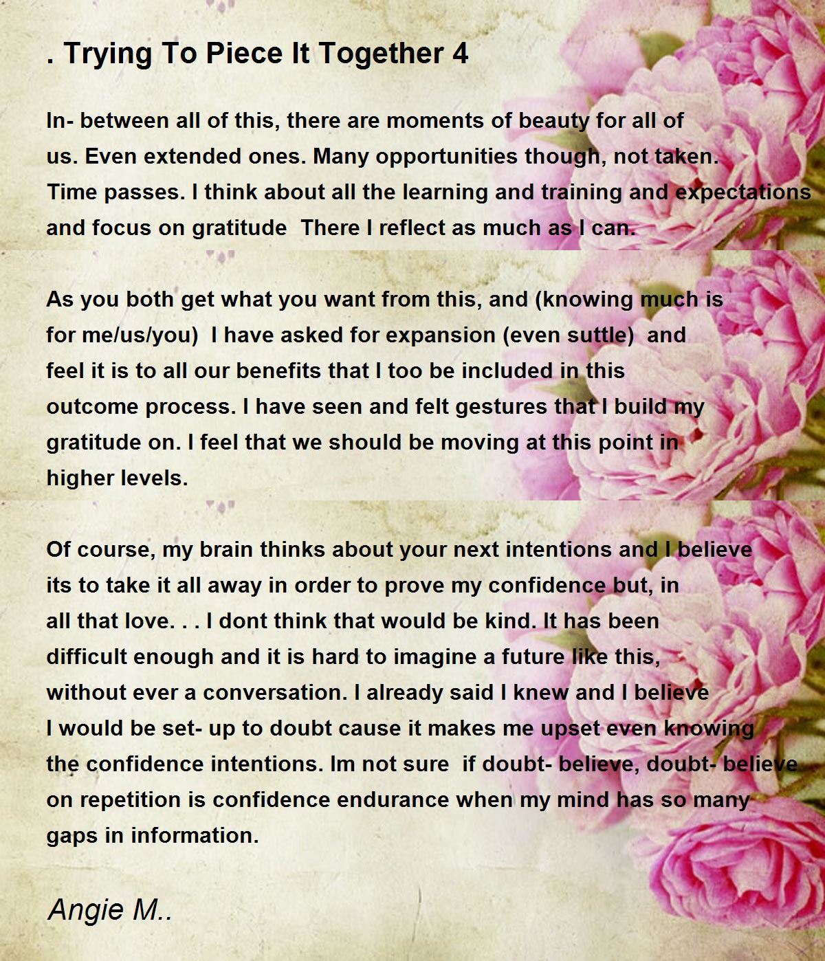 Of course, my brain thinks about your next intentions and I believe its to take it all away in order to prove my confidence but, in all that love...I dont think that would be kind. It has been difficult enough and it is hard to imagine a future like this, without ever a conversation. I already said I knew and I believe I would be set-up to doubt cause it makes me upset even knowing the confidence intentions. Im not sure if doubt-believe, doubt-believe on repetition is confidence endurance when my mind has so many gaps in information.