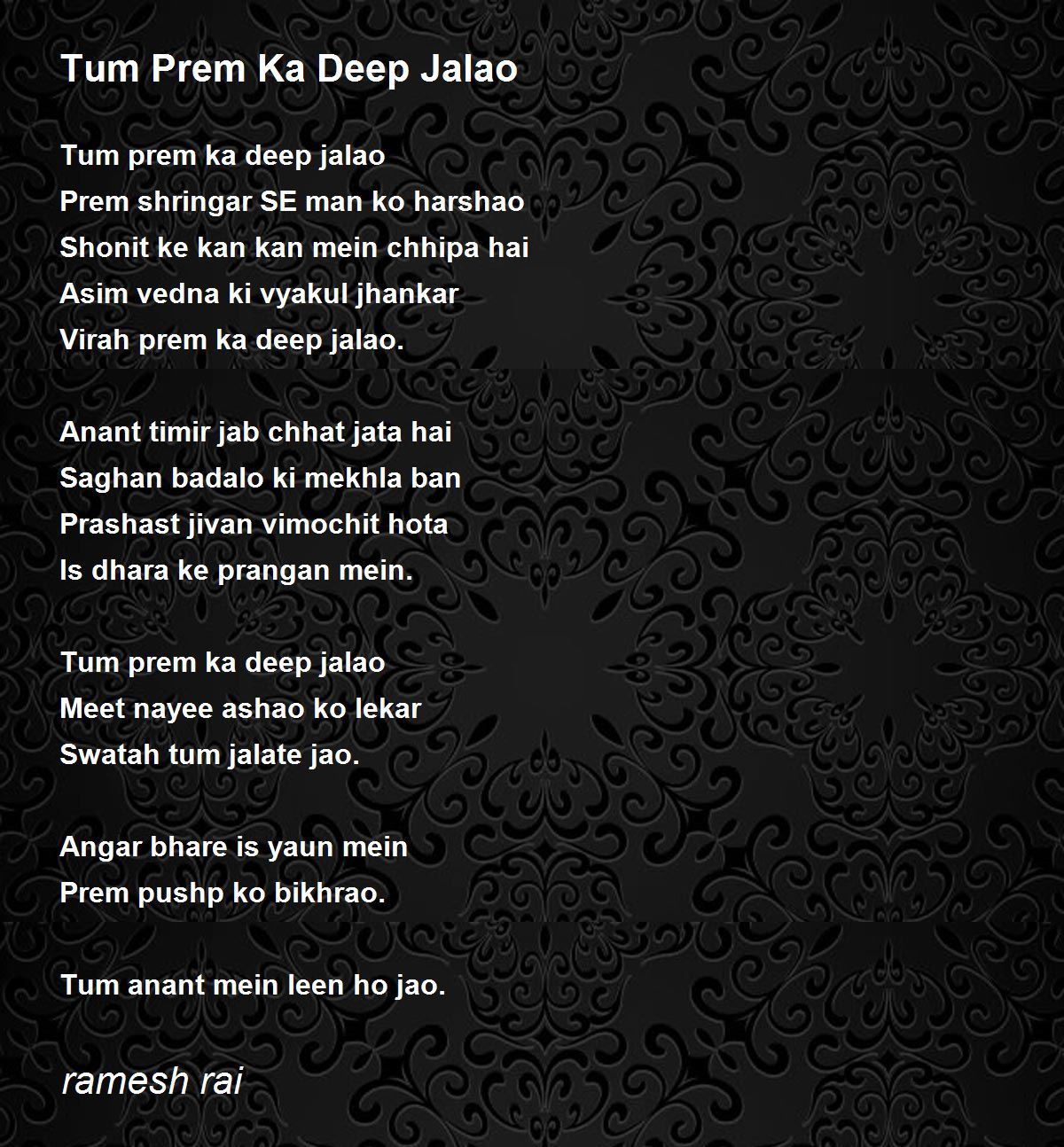 Tum prem ka deep jalae rakhna, Main chnda ban kar aaoon ga, Gar chandr grahan ki raina hui, Main swem chanda ban jaoon ga. Aandhi aaye ya pawan chale, Yeh deep na bujhne dena kabhi, Meri rah pe tikaye rakhna priye, Aankhein na bhatakne dena kabji. Yeh deep agar jo bujhne lage, Tum apna aap jala dena, IIs prem mein kitni shakti hy, Sansar ko sare bata dena, Jis ganga mein rakh bahegi teri, Main dooboon ga us Ganga mein, Sangam to hamara hona hay, Lekin phirbhi main ro doon ga. This poem was written in only 2 or 3 minutes just after reading your lovely poem, it may contain some errors, you are a great poet, you may revise it.