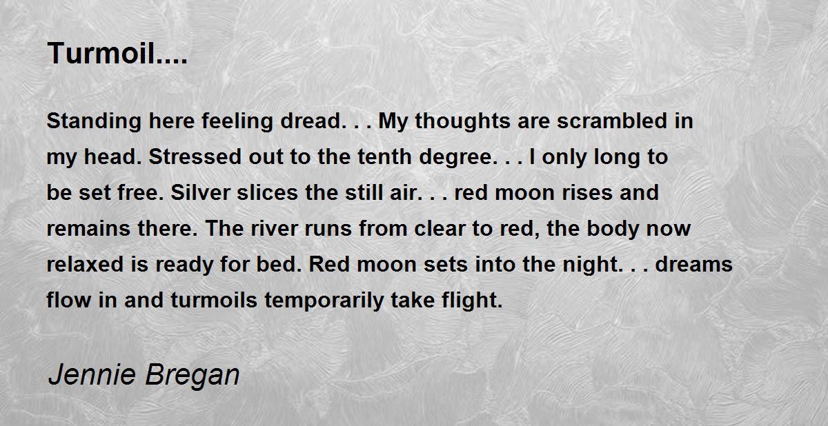 Standing here feeling dread...My thoughts are scrambled in my head. Stressed out to the tenth degree...I only long to be set free. Silver slices the still air...red moon rises and remains there. The river runs from clear to red, the body now relaxed is ready for bed. Red moon sets into the night...dreams flow in and turmoils temporarily take flight.