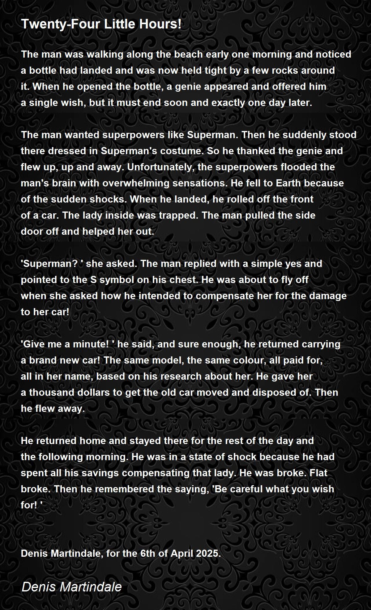 The man wanted superpowers like Superman. Then he suddenly stood there dressed in Superman's costume. So he thanked the genie and flew up, up and away. Unfortunately, the superpowers flooded the man's brain with overwhelming sensations. He fell to Earth because of the sudden shocks. When he landed, he rolled off the front of a car. The lady inside was trapped. The man pulled the side door off and helped her out.