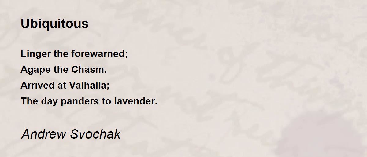 Linger the forewarned; Agape the Chasm. Arrived at Valhalla; The day panders to lavender.