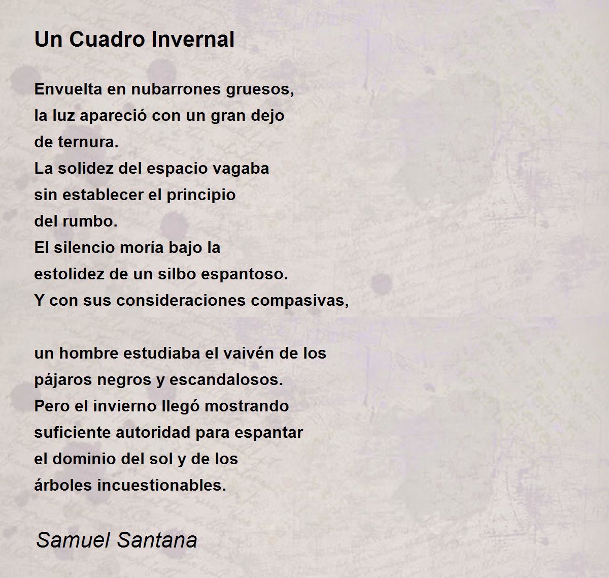 Me gusta mucho este poema, Samuel. Here is a translation (done by Google translate, not by me) . Wrapped in heavy thunderclouds, The light appeared with a big drop Of tenderness. The solidity of space roamed Without establishing the principle Of course. The silence died under the Sturdiness of a frightening whistle. And with his compassionate considerations, A man studied the swing of the Black and scandalous birds. But winter came showing Sufficient authority to frighten The dominion of the sun and Unquestionable trees.