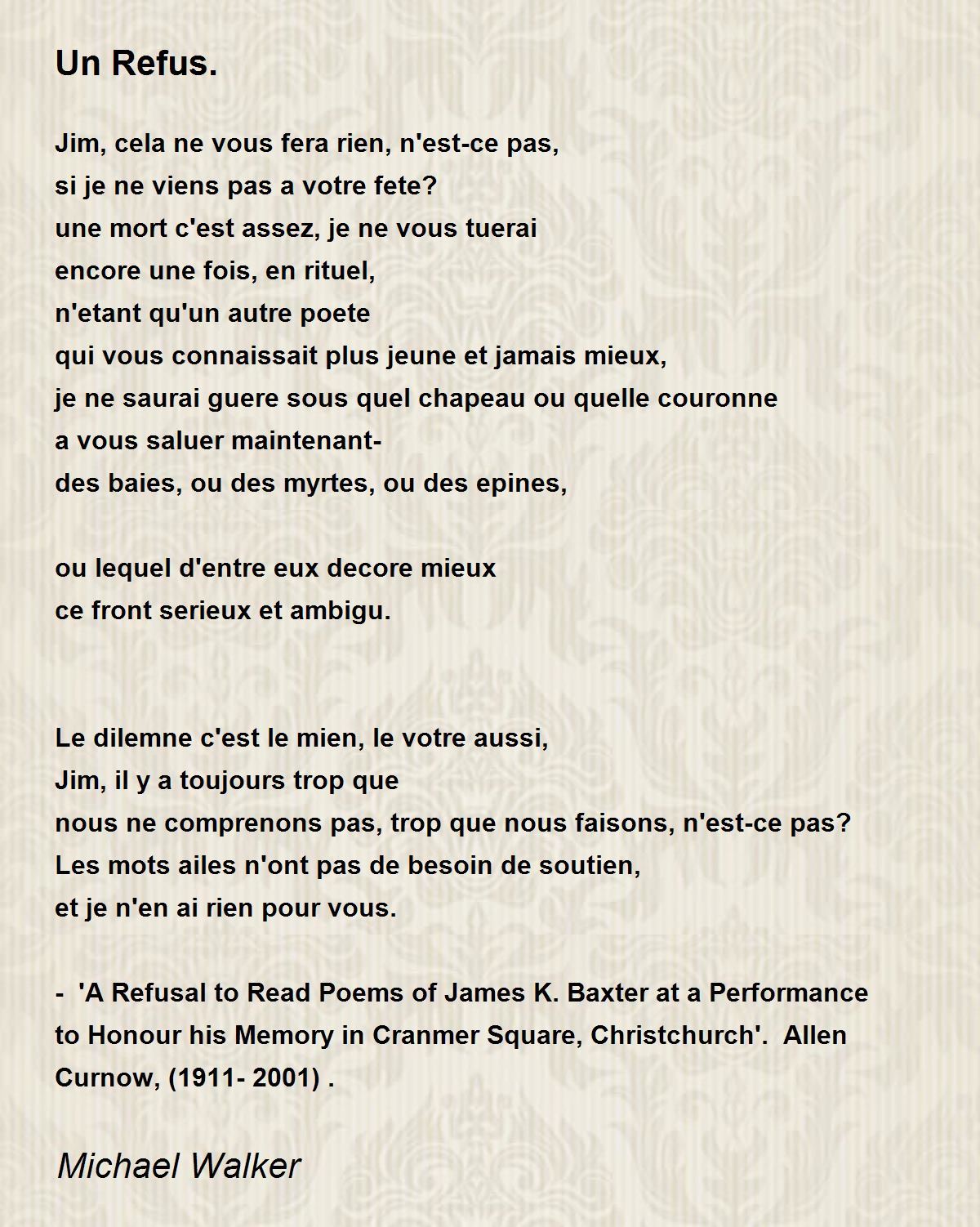 - 'A Refusal to Read Poems of James K. Baxter at a Performance to Honour his Memory in Cranmer Square, Christchurch'. Allen Curnow, (1911-2001) .