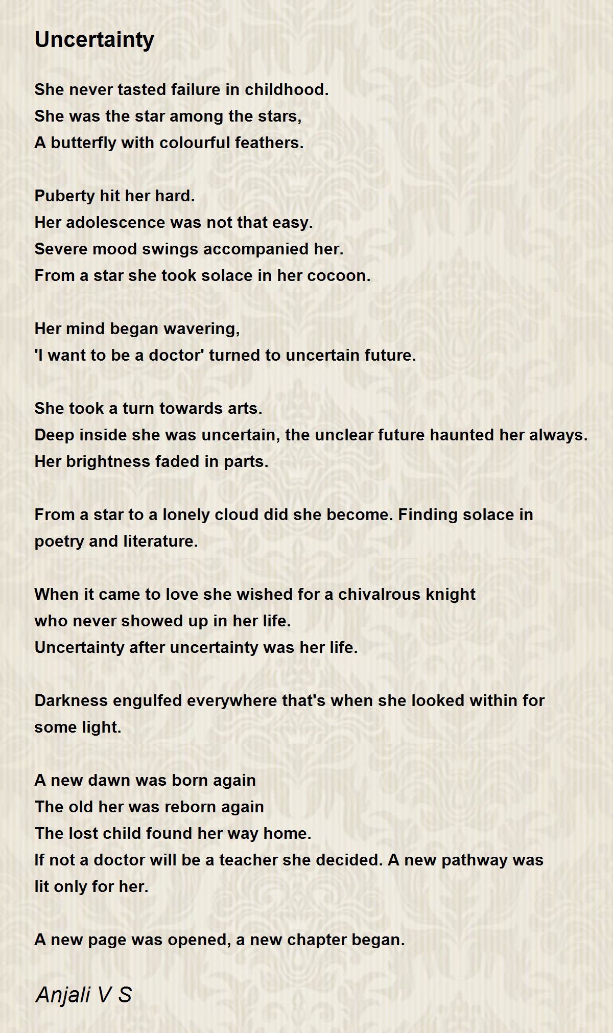 Deep inside she was uncertain, the unclear future haunted her always.