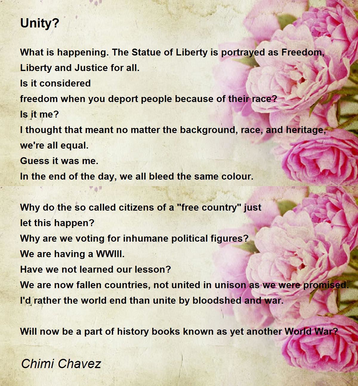 What is happening. The Statue of Liberty is portrayed as Freedom, Liberty and Justice for all.