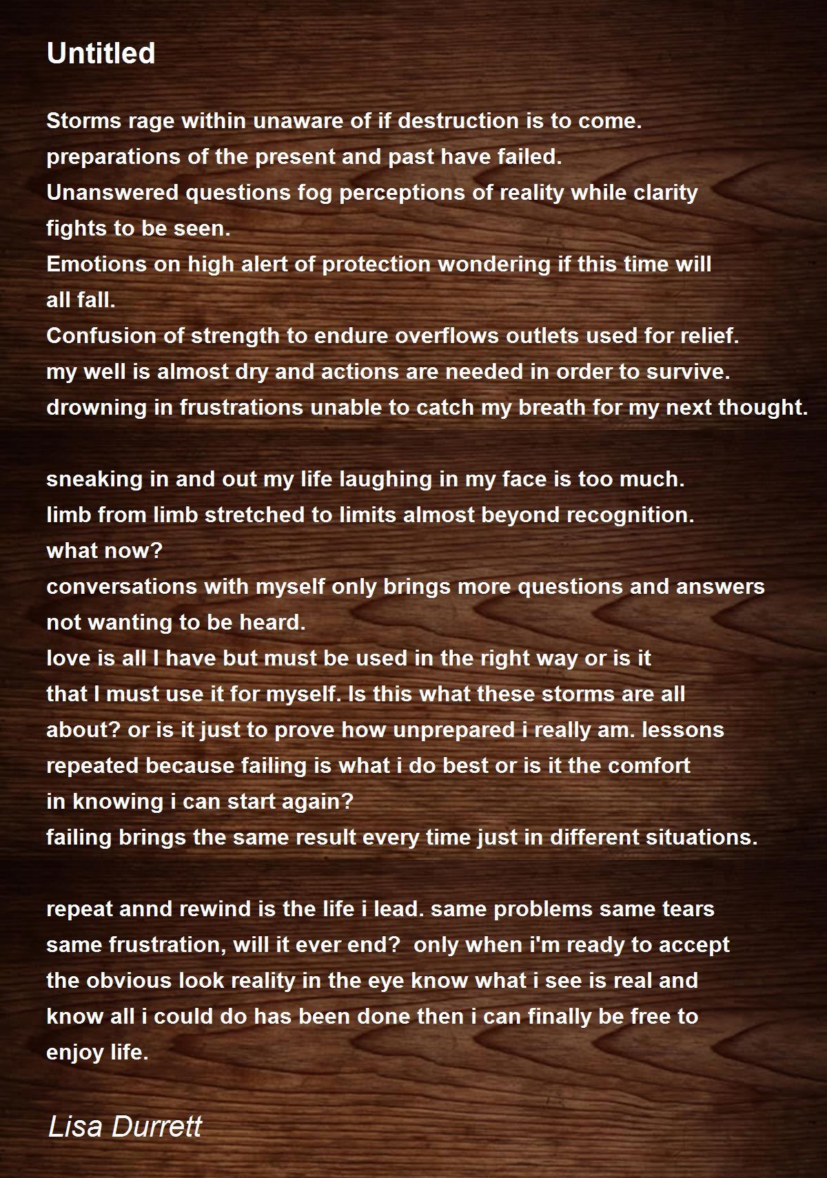 love is all I have but must be used in the right way or is it that I must use it for myself. Is this what these storms are all about? or is it just to prove how unprepared i really am. lessons repeated because failing is what i do best or is it the comfort in knowing i can start again?