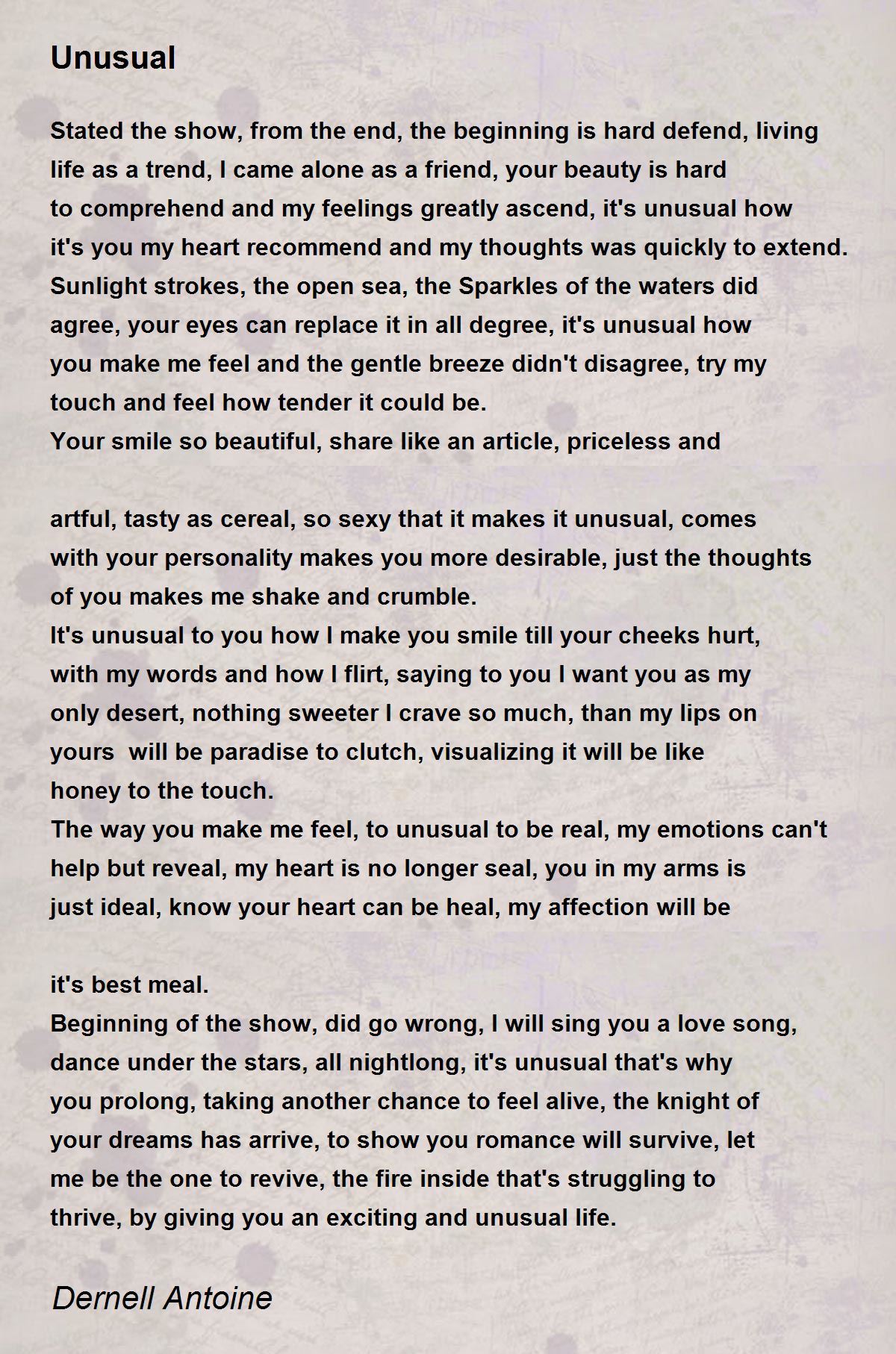 It's unusual to you how I make you smile till your cheeks hurt, with my words and how I flirt, saying to you I want you as my only desert, nothing sweeter I crave so much, than my lips on yours will be paradise to clutch, visualizing it will be like honey to the touch.