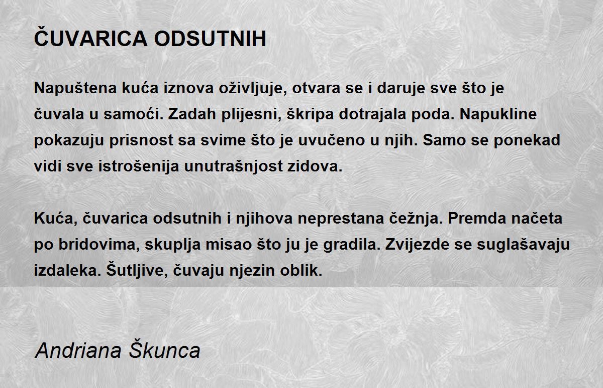 Kuća, čuvarica odsutnih i njihova neprestana čežnja. Premda načeta po bridovima, skuplja misao što ju je gradila. Zvijezde se suglašavaju izdaleka. Šutljive, čuvaju njezin oblik.