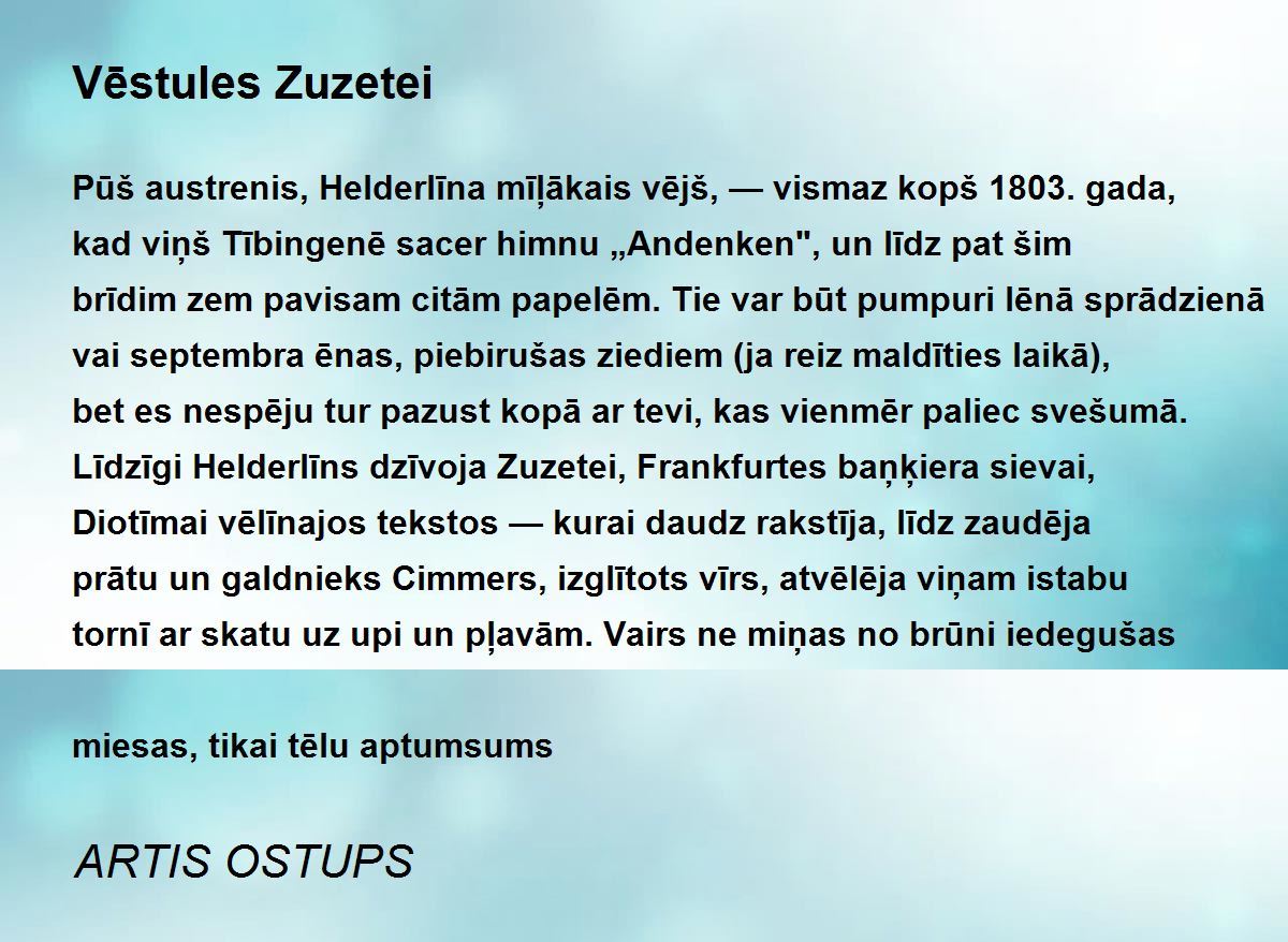 Pūš austrenis, Helderlīna mīļākais vējš, — vismaz kopš 1803. gada, kad viņš Tībingenē sacer himnu „Andenken", un līdz pat šim brīdim zem pavisam citām papelēm. Tie var būt pumpuri lēnā sprādzienā vai septembra ēnas, piebirušas ziediem (ja reiz maldīties laikā), bet es nespēju tur pazust kopā ar tevi, kas vienmēr paliec svešumā. Līdzīgi Helderlīns dzīvoja Zuzetei, Frankfurtes baņķiera sievai, Diotīmai vēlīnajos tekstos — kurai daudz rakstīja, līdz zaudēja prātu un galdnieks Cimmers, izglītots vīrs, atvēlēja viņam istabu tornī ar skatu uz upi un pļavām. Vairs ne miņas no brūni iedegušas miesas, tikai tēlu aptumsums