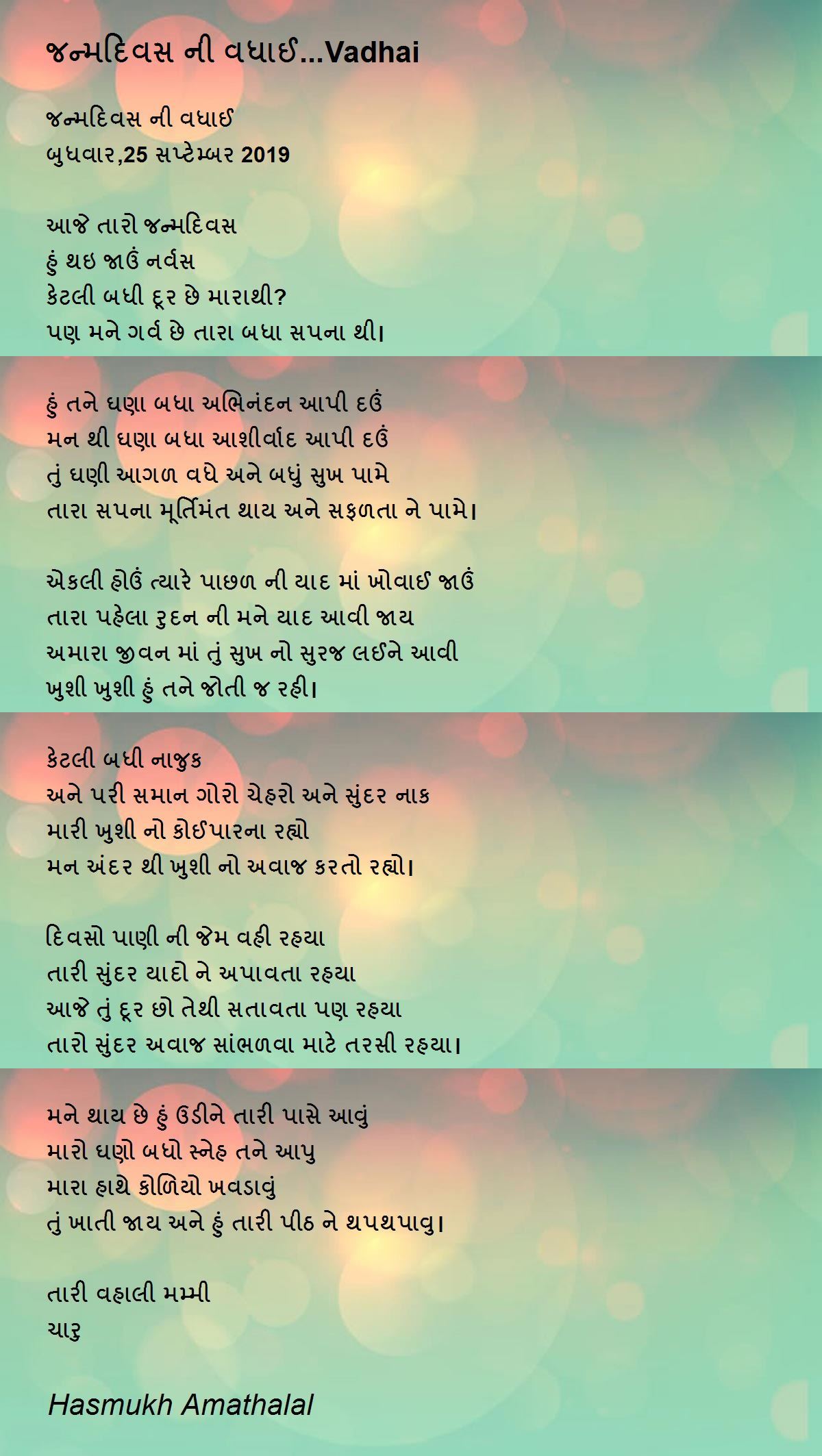મને થાય છે હું ઉડીને તારી પાસે આવું મારો ઘણો બધો સ્નેહ તને આપુ મારા હાથે કોળિયો ખવડાવું તું ખાતી જાય અને હું તારી પીઠ ને થપથપાવુ। તારી વહાલી મમ્મી ચારુ Hasmukh Amathalal