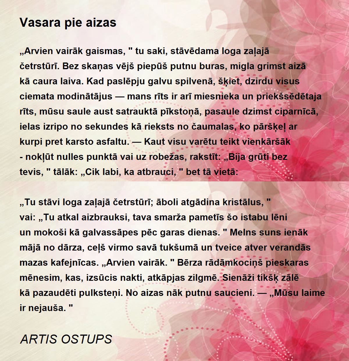 „Arvien vairāk gaismas," tu saki, stāvēdama loga zaļajā četrstūrī. Bez skaņas vējš piepūš putnu buras, migla grimst aizā kā caura laiva. Kad paslēpju galvu spilvenā, šķiet, dzirdu visus ciemata modinātājus — mans rīts ir arī miesnieka un priekšsēdētaja rīts, mūsu saule aust satrauktā pīkstoņā, pasaule dzimst ciparnīcā, ielas izripo no sekundes kā rieksts no čaumalas, ko pāršķeļ ar kurpi pret karsto asfaltu. — Kaut visu varētu teikt vienkāršāk - nokļūt nulles punktā vai uz robežas, rakstīt: „Bija grūti bez tevis," tālāk: „Cik labi, ka atbrauci," bet tā vietā: „Tu stāvi loga zaļajā četrstūrī; āboli atgādina kristālus," vai: „Tu atkal aizbrauksi, tava smarža pametīs šo istabu lēni un mokoši kā galvassāpes pēc garas dienas." Melns suns ienāk mājā no dārza, ceļš virmo savā tukšumā un tveice atver verandās mazas kafejnīcas. „Arvien vairāk." Bērza rādāmkociņš pieskaras mēnesim, kas, izsūcis nakti, atkāpjas zilgmē. Sienāži tikšķ zālē kā pazaudēti pulksteņi. No aizas nāk putnu saucieni. — „Mūsu laime ir nejauša."