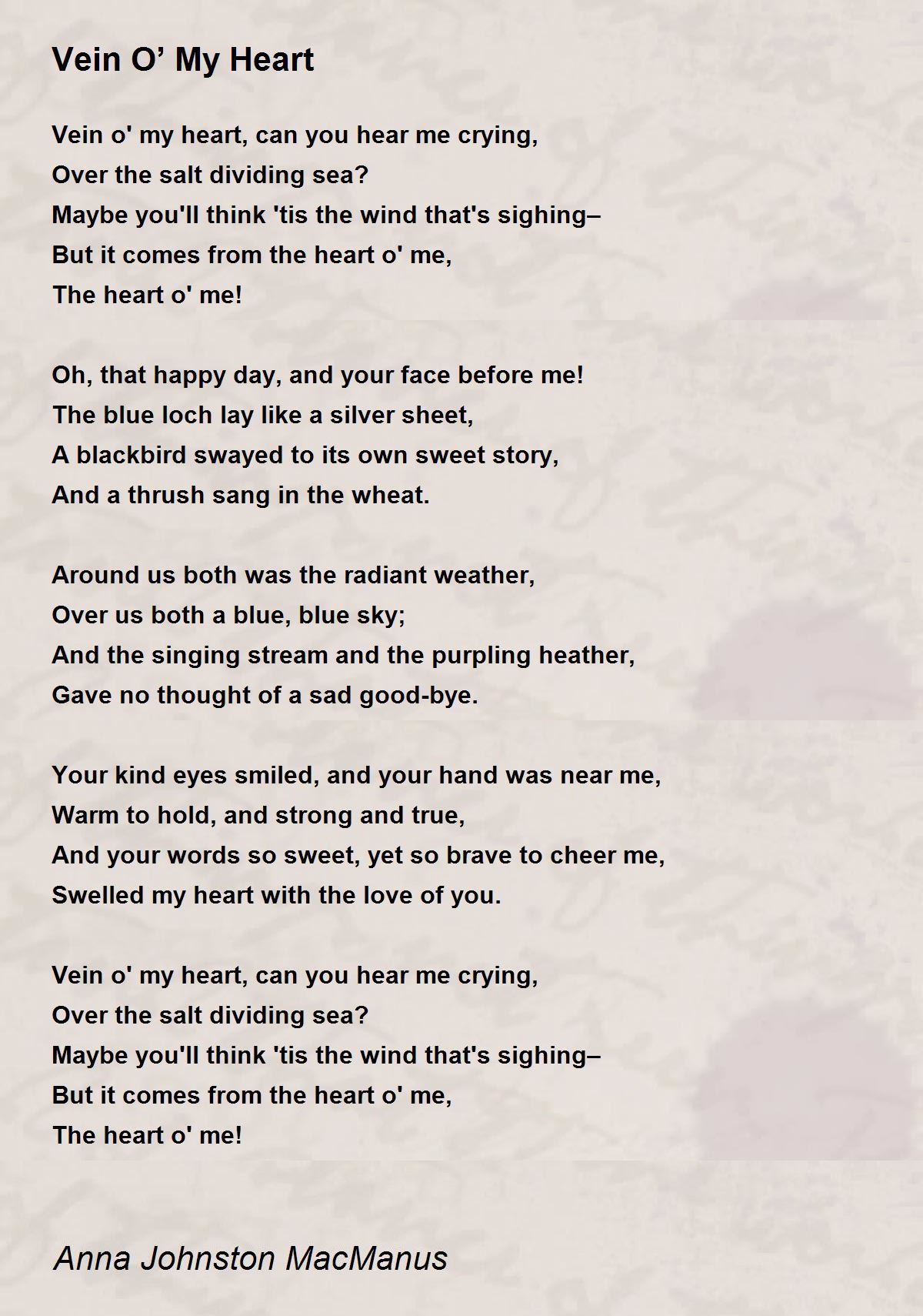 Vein o' my heart, can you hear me crying,