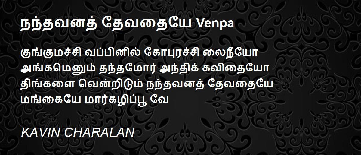 குங்குமச்சி வப்பினில் கோபுரச்சி லைநீயோஅங்கமெனும் தந்தமோர் அந்திக் கவிதையோதிங்களை வென்றிடும் நந்தவனத் தேவதையேமங்கையே மார்கழிப்பூ வே