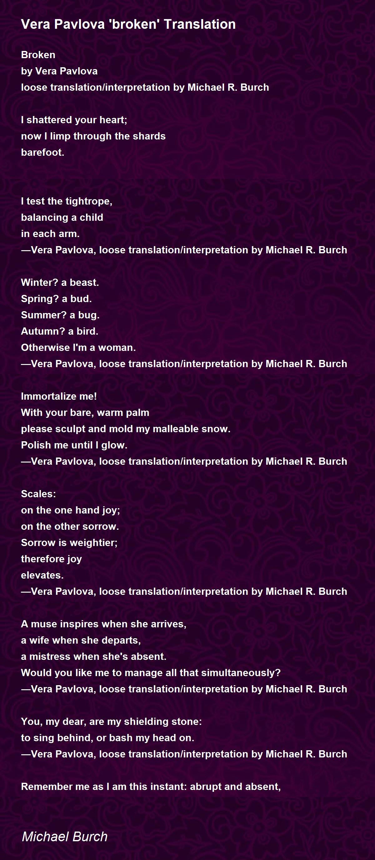 Vera Pavlova is a Russian poet. Born in Moscow, she is a graduate of the Schnittke College of Music and the Gnessin Academy of Music, where she specialized in music history. She is the author of twenty collections of poetry, four opera librettos, and the lyrics to two cantatas. Her poetry has appeared in The New Yorker and other major literary publications. Keywords/Tags: Shattered, shatter, shards, broken heart, broken friendship, broken future, fragility, fragment, glass, limp, limping, barefoot, heartache, heartbroken, anguish, anguished, Pavlova, Russian, translation, epigram