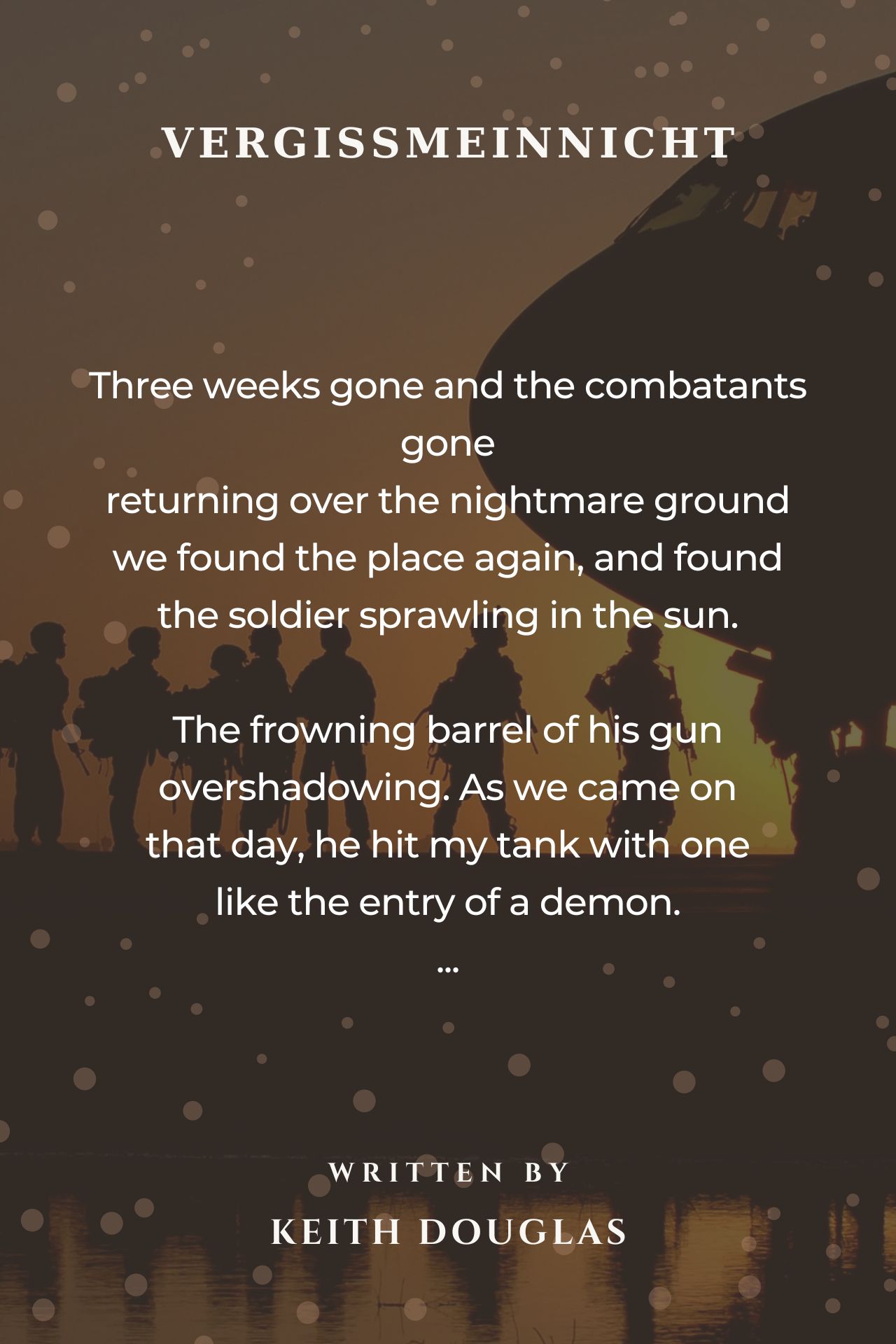 Three weeks dead is a ripe convulsive corpse, the imagery is stark, unsettling, graphic, realist, form the personification of the 'frowning barrel of his gun' lies the implication of other hits upon other tanks both made and not made; the last hit was upon the narrator's tank As we came on that day, he hit my tank with one like the entry of a demon. No mention is made of deaths or casualties suffered by the narrator's tank crew, this is a surgical viewing of the fallen enemy, who has been left not on the glorious heroic field of battle but on the 'nightmare ground' unburied. The first stanza introduction to this slain enemy is low key, he is 'found the soldier sprawling in the sun' as if sunbathing. In the third stanza like tourists viewing points of interest in a foreign landscape we are commanded Look. Here in the gunpit spoil the dishonoured picture of his girl who has put: Steffi. Vergissmeinnicht. in a copybook gothic script. ** No pity is immediately expressed, no remorse, the implications of simmering anger and hatred linger, are expressed as We see him almost with content, abased, and seeming to have paid and mocked at by his own equipment that's hard and good when he's decayed. He his paid the price for his past killings in death, even his equipment is valued more than he, his weapons remain hard and good as he decays, will remain formidable when he is completely decayed. The impact of how his corpse looks crawling with flies is delivered through contrast, his girlfriend or wife, remembers him strong youth as he was But she would weep to see today how on his skin the swart flies move; the dust upon the paper eye and the burst stomach like a cave. In the last stanza are intermixed two images, 'lover and killer', the lover she knew who will never return and the killer left to rot. She remembers 'one body and one heart', we have been introduced to the staring face of death; the paper eye dust covered is lifeless, the stomach blown open with a horrific wound like a cave, the open life upon the features of this decaying wreck of youth is 'on his skin the swart flies move'. This is the image we carry into the final stanza, without a prayer we will leave this rotting corpse For here the lover and killer are mingled who had one body and one heart. And death who had the soldier singled has done the lover mortal hurt. Death is stronger than love, love failed to protect the soldier, the lover's heart will beat no more, because death singled this lover out and did his 'lover mortal hurt.' Those who glorify war should learn a lesson from this poem. 10+++