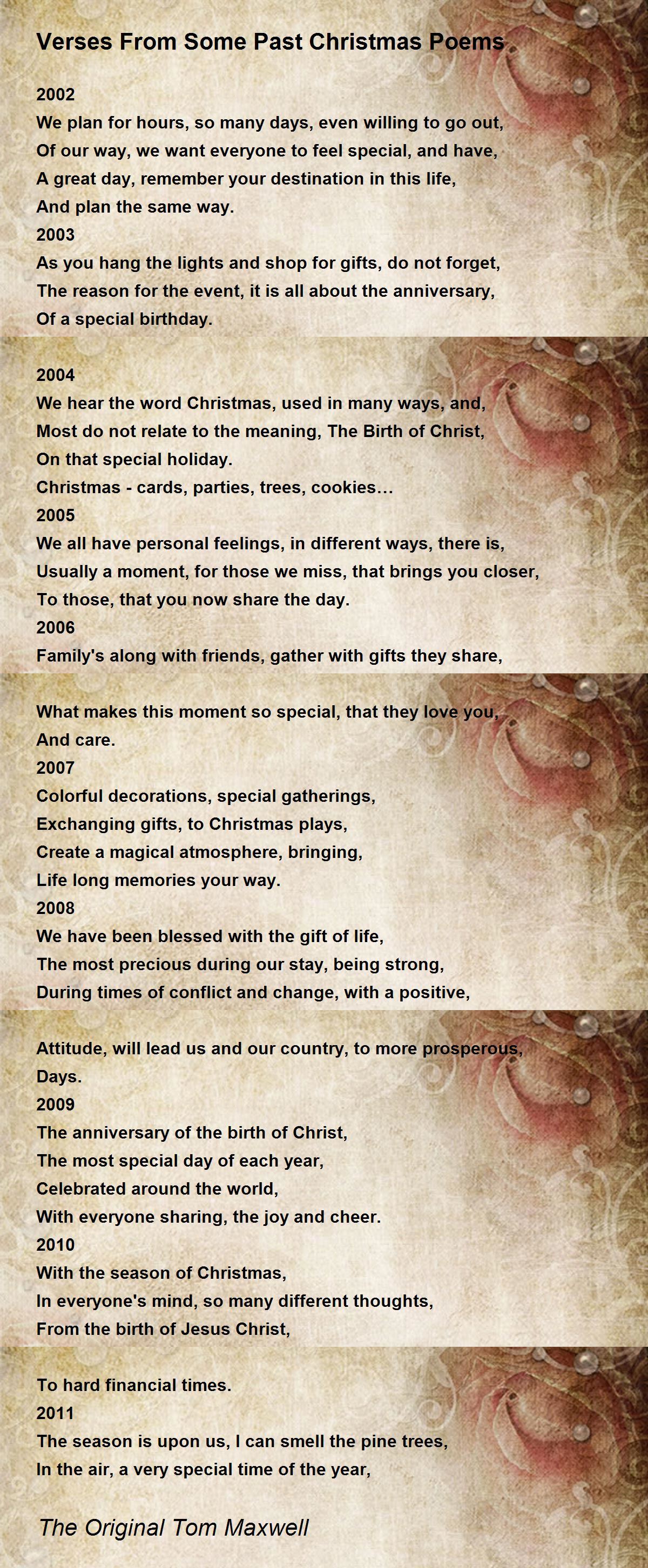 Each verse from different years, every year is the same, if your lucky you stand behind more smiles than tears Tom