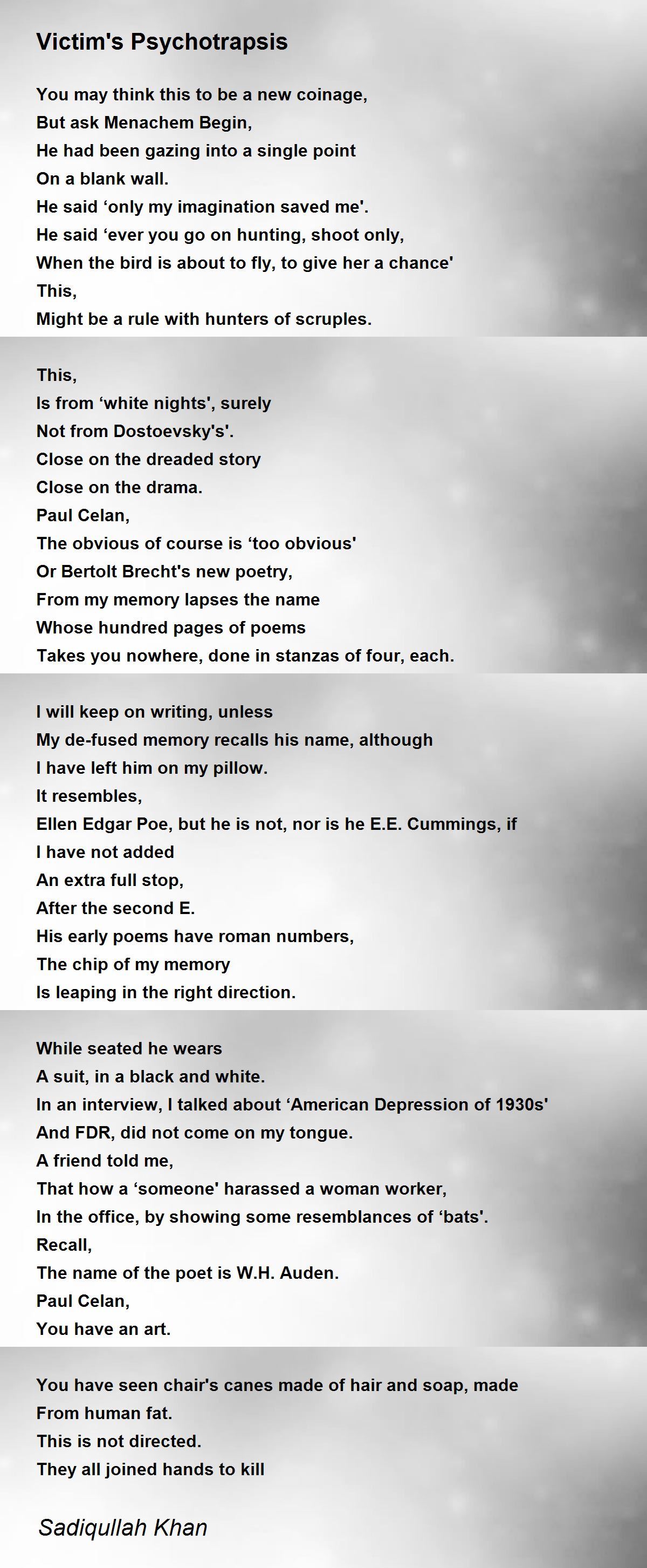 -It plays on some of the names who matter in global culture and have a touch on the conscience of civilization. White Nights, of Menachem Begin was my favorite book, his memoirs of Prison in Russia, and the above quotes are still in my memory. W.H. Auden is profound and rich in imagination. I immensely like the poems of Paul Celan. The romance for American history is with Gone With the Wind of Margaret Mitchel and the movie starring Vivien Leigh and Clark Gable. The poem is 'intermittent stream of consciousnesses'.
