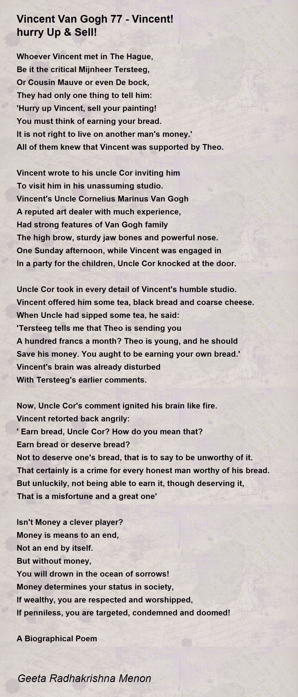 Every now and then the situation brings discomfiture right at the time when Vincent hoped to receive assurance from a person or a relative. Great poem. Thanks, Geeta ji.