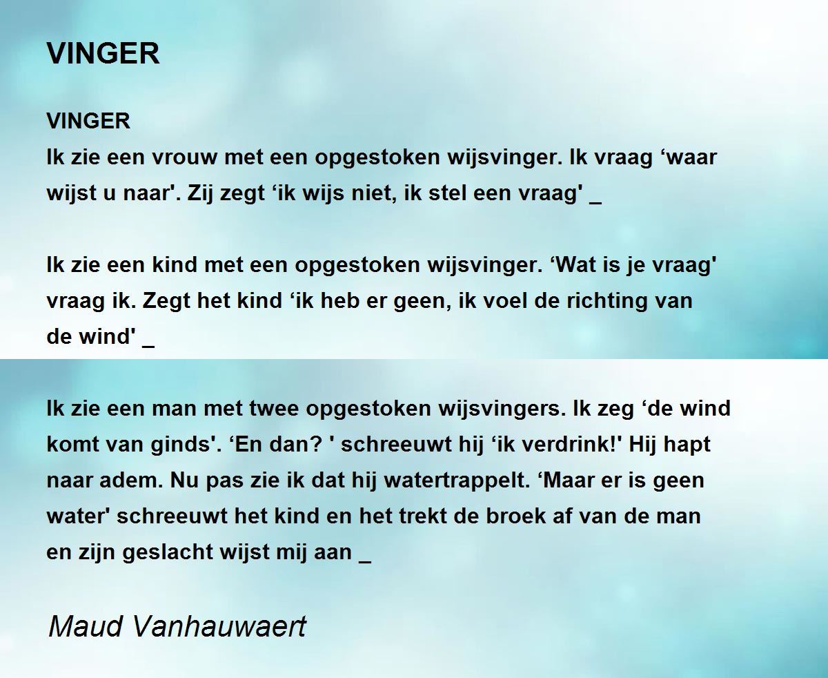 Ik zie een vrouw met een opgestoken wijsvinger. Ik vraag ‘waar wijst u naar'. Zij zegt ‘ik wijs niet, ik stel een vraag' _