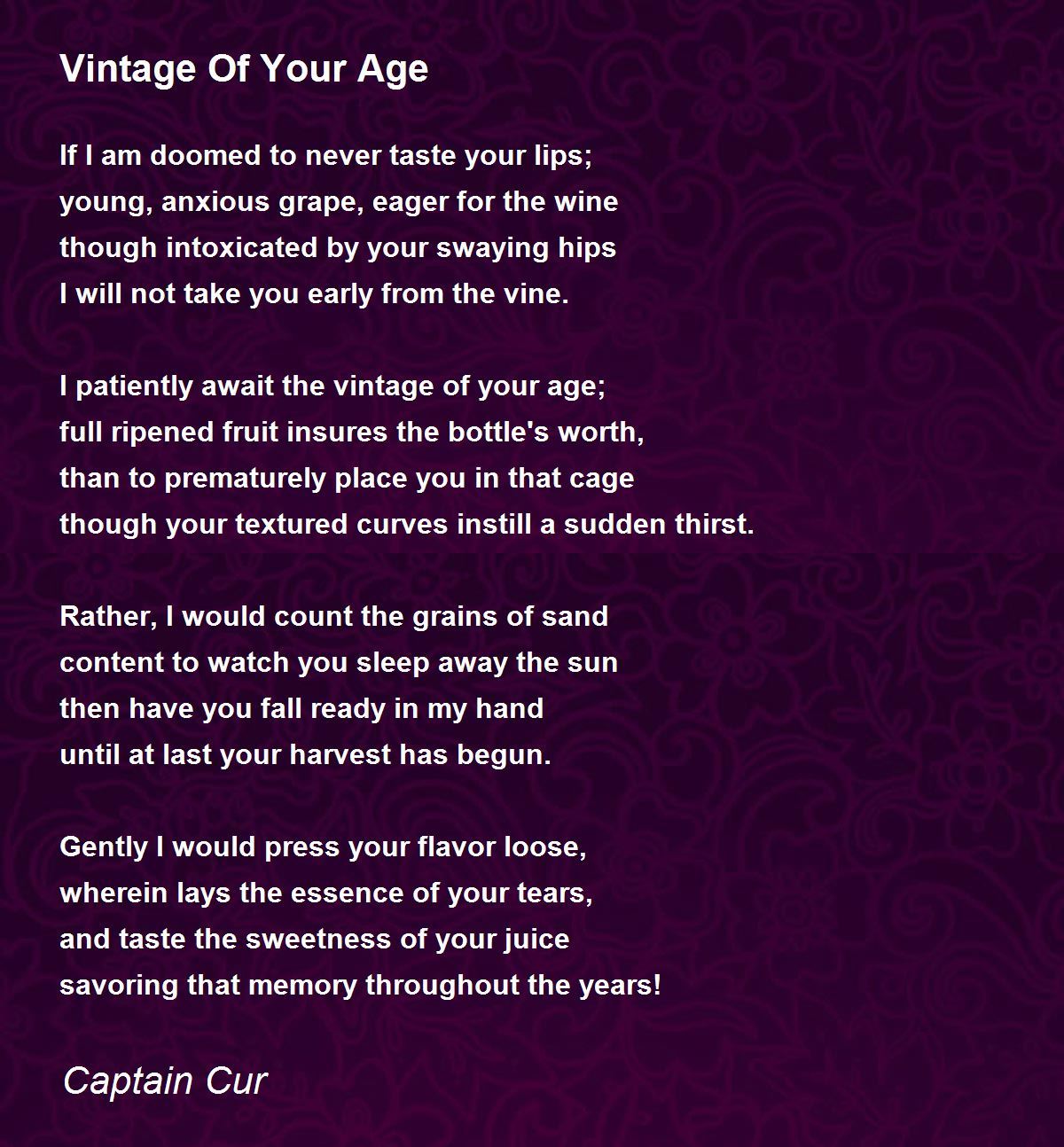 Excellent Captain 1600 born death all know now will only after the occurrence will announce ere upon me u pounce I let ye savour the wine which has to yet change form off the vine and when she says be mine feel her under as does you Divine and for the next few centuries love labour and ports refine drinking all kinds of different wines preferably red as is mine