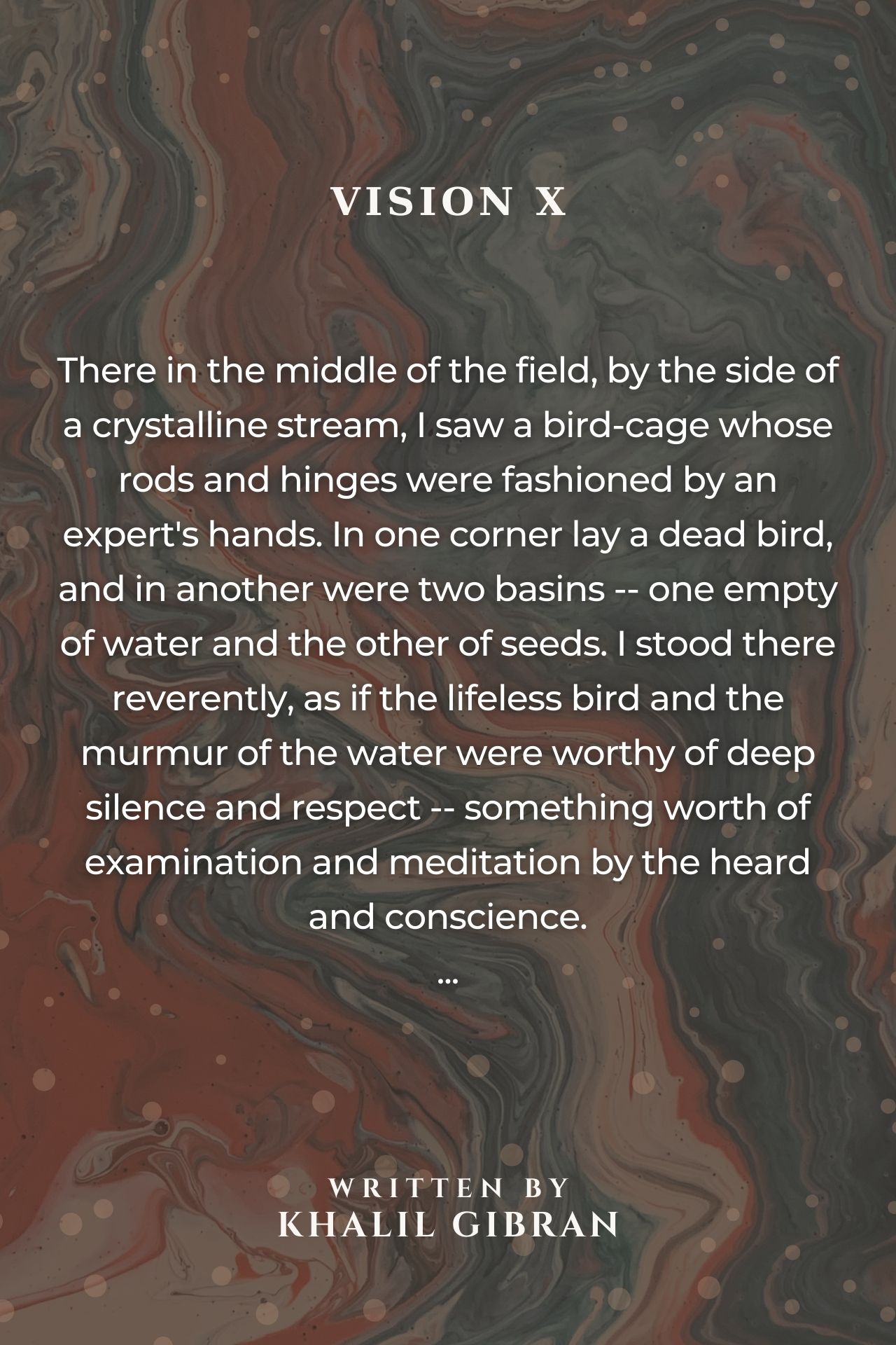 There in the middle of the field, by the side of a crystalline stream, I saw a bird-cage whose rods and hinges were fashioned by an expert's hands. In one corner lay a dead bird, and in another were two basins - one empty of water and the other of seeds. I stood there reverently, as if the lifeless bird and the murmur of the water were worthy of deep silence and respect - something worth of examination and meditation by the heard and conscience.